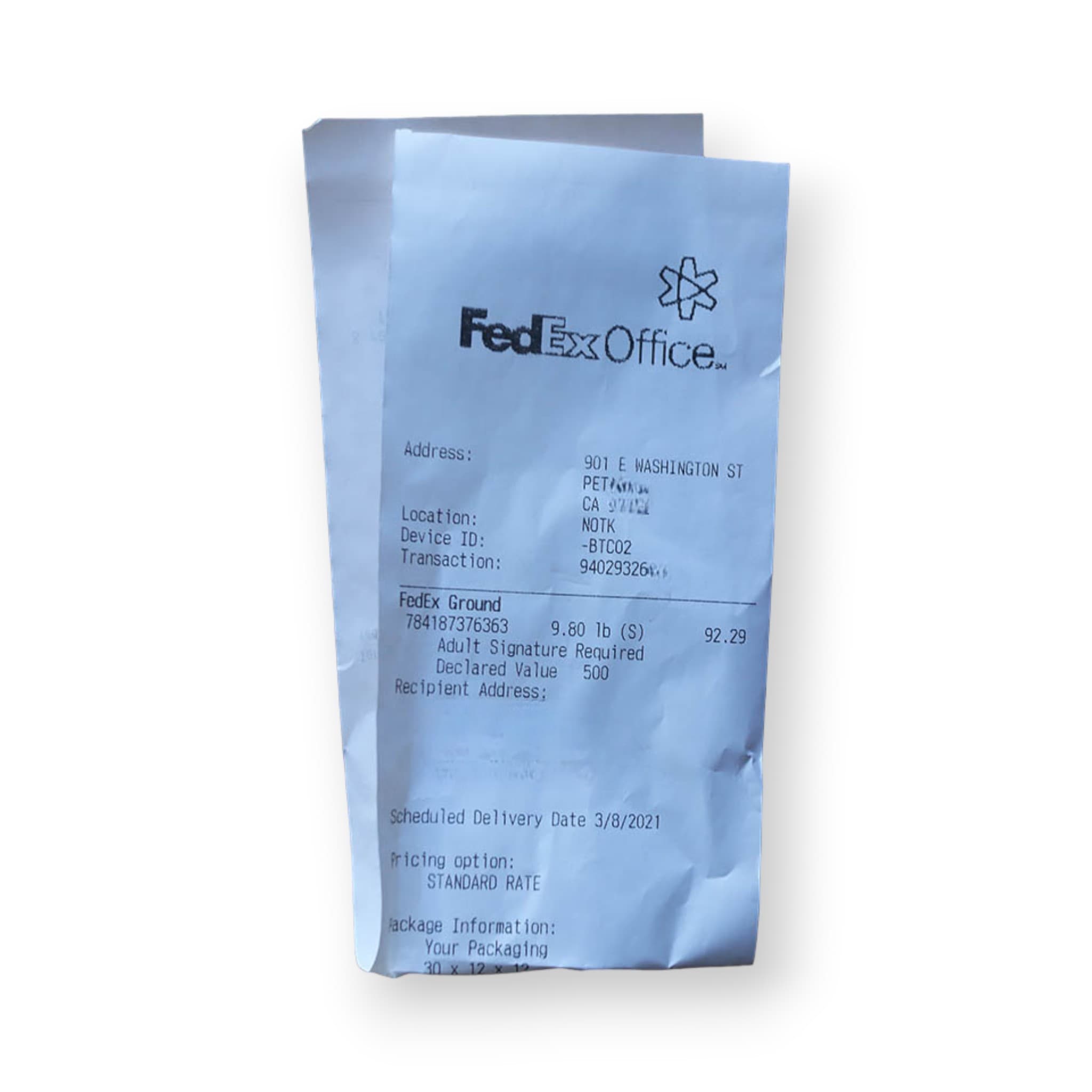 After you have completed the box process, simply drop it off at a FedEx location near you or schedule a pickup. You MUST obtain a physical drop-off receipt and CANNOT drop off at a location that is not FedEx branded (Grocery Store, Pack N' Ship etc.)
