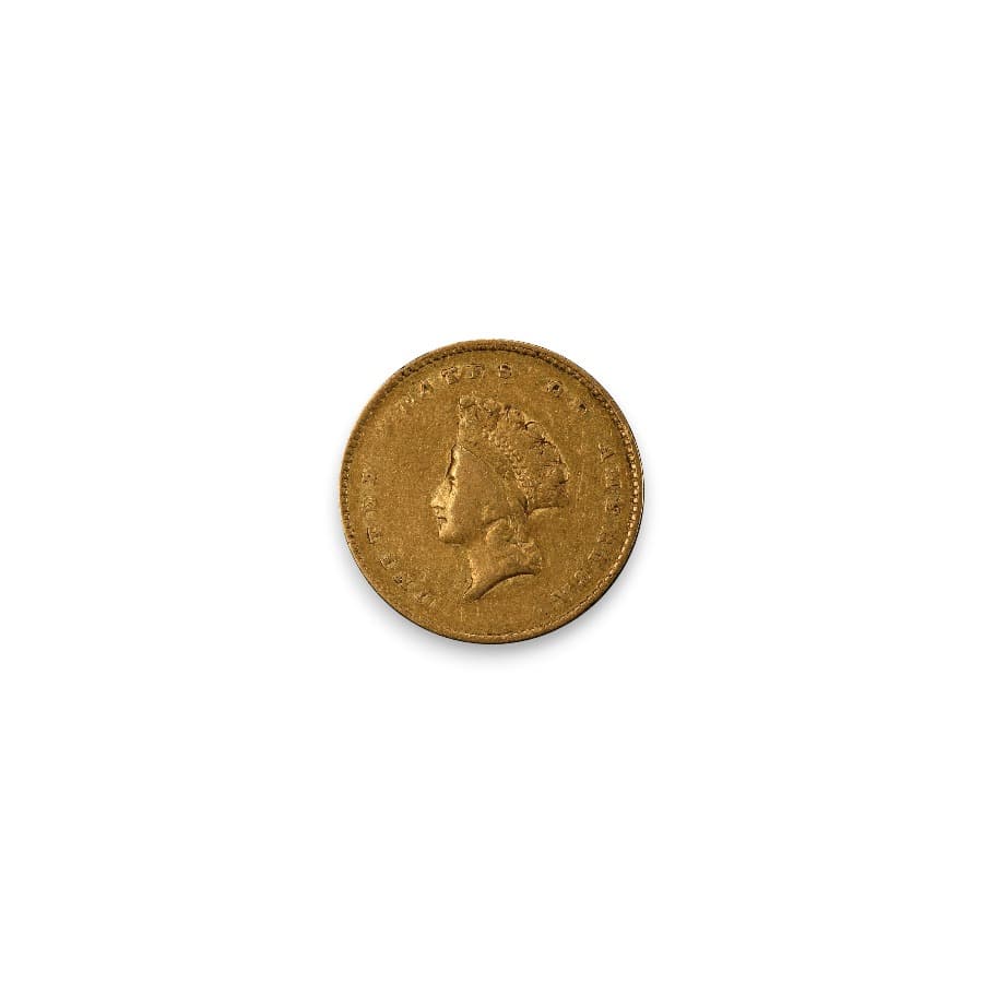The $1 Gold Dollar Type 2 Indian Princess, minted from 1854 to 1856, is a remarkable and historically significant coin in American numismatic history. Designed by James B. Longacre, it features a unique obverse design with a head of Liberty wearing a feathered headdress, surrounded by stars and inscribed with "UNITED STATES OF AMERICA." The reverse displays the denomination "1 DOLLAR" and the date within a wreath of corn, cotton, tobacco, and wheat. These coins are distinguished by their small size, with a diameter of 15 millimeters and a gold content of 0.04837 ounces. Due to their limited mintage and distinctive design, the $1 Gold Dollar Type 2 Indian Princess coins hold a special place in coin collections and are highly sought after by collectors and numismatists for their historical significance and beauty.