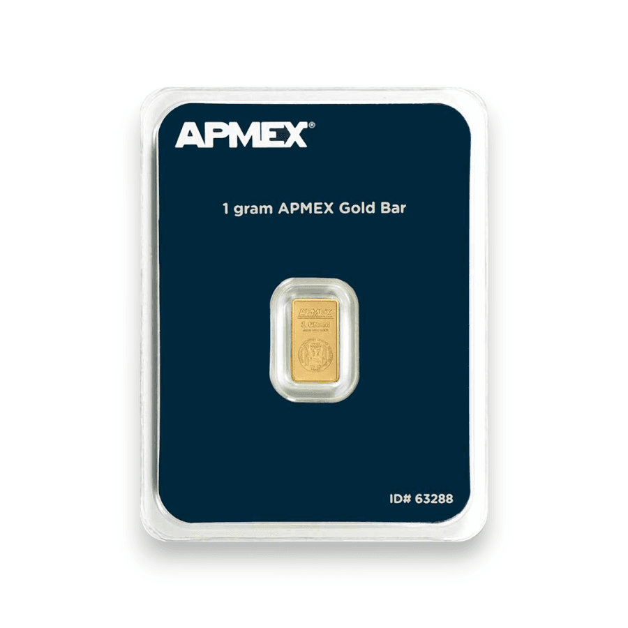 The 1 Gram APMEX Gold Bar, with a .9999 fine purity and sealed in a carded assay, is a popular and accessible product for those looking to invest in gold. Produced by American Precious Metals Exchange (APMEX), a trusted name in the precious metals industry, this bar contains 1 gram of 99.99% pure gold. Its small size makes it an affordable option for both new and seasoned investors. The bar typically features the APMEX logo and is stamped with its weight and purity. It comes enclosed in a tamper-evident assay card, which serves not only as protective packaging but also as a certificate of authenticity. This card includes important details such as the bar's weight, purity, and a unique serial number, ensuring its authenticity and quality. The 1 Gram APMEX Gold Bar is favored for its fine craftsmanship, high purity, and the reputation of APMEX, making it a valuable and secure choice for those looking to diversify their investment portfolio with small increments of gold.