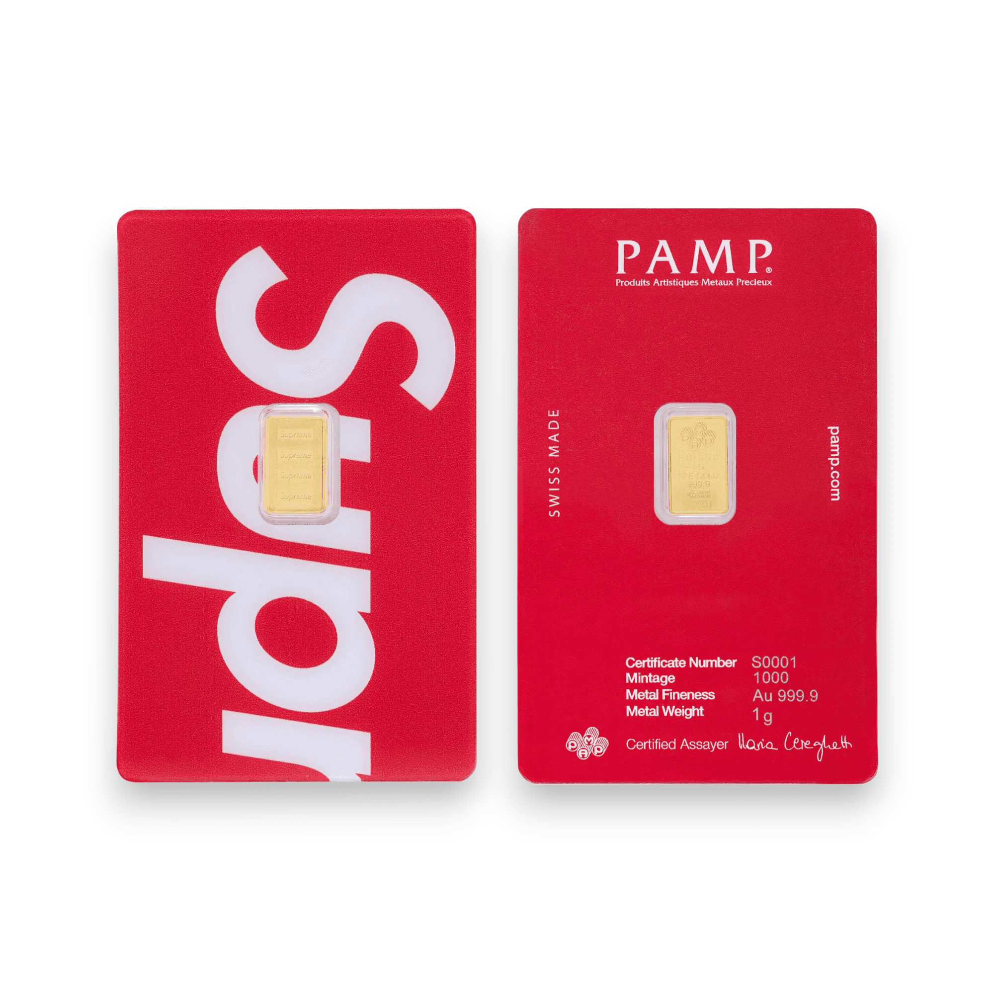 The Supreme®/PAMP Suisse 1 g Gold Bar blends luxury streetwear culture with world-renowned precious metals craftsmanship in a compact and highly collectible format. Each bar contains 1 gram of .9999 fine gold and features molded Supreme and PAMP Suisse logos, creating a bold, modern design that reflects the exclusivity of both brands. The bar is produced in Switzerland by PAMP Suisse, a global leader in bullion manufacturing known for exceptional quality and precision.