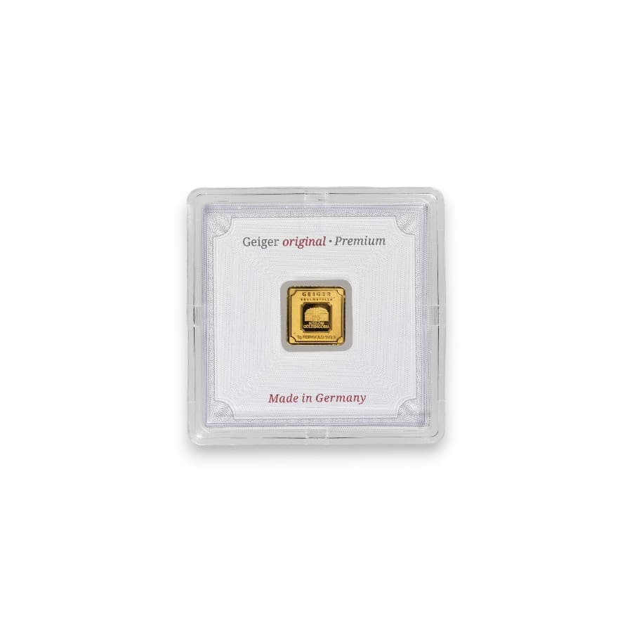 The 1 Gram Gold Geiger Original Bar is a meticulously crafted piece of investment-grade precious metal from Geiger Edelmetalle AG, renowned for its commitment to quality and security. Minted with .9999 fine gold, this bar is securely sealed within a carded assay, which provides a detailed certification of the bar's authenticity, weight, and purity. This level of documentation assures investors of the integrity and value of their purchase. The design of the bar features the esteemed Schloss Güldengossa, emblematic of Geiger Edelmetalle's rich heritage and dedication to excellence in the field of precious metals. Additionally, advanced security features, including UV-light-readable elements and a unique serial number on the assay card, offer unparalleled protection against counterfeiting. The 1 Gram Gold Geiger Original Bar, with its compact size and high purity, is an ideal choice for investors and collectors seeking to diversify their portfolios with gold, offering both the tangible benefits of precious metal investment and the peace of mind that comes with Geiger Edelmetalle's reputation for quality and innovation.