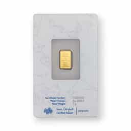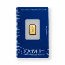 The 1 Gram PAMP Rosa Gold Bar, sealed in an assay card and featuring a .9999 fine gold purity, exemplifies PAMP Suisse's renowned craftsmanship and attention to detail. This exquisite gold bar showcases the elegant Rosa design, a delicate and intricate depiction of a rose that symbolizes beauty, purity, and wealth across various cultures. PAMP Suisse, a leading Swiss refinery known for its innovative and artistically designed precious metal products, ensures each Rosa gold bar is not only a valuable piece of fine gold but also a work of art. The bar comes securely sealed within a tamper-evident assay card, which provides essential details such as the bar's weight, purity, and a unique serial number, offering an added layer of security and authenticity. This packaging guarantees the bar's condition while making it an attractive and trustworthy option for investors and collectors alike. The 1 Gram PAMP Rosa Gold Bar is sought after for its blend of investment appeal and aesthetic beauty, making it an ideal gift or a cherished addition to any collection of fine gold.