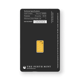The 1 Gram Perth Mint Gold Bar, marked with .9999 fine purity and sealed in an assay card, is a small yet valuable offering from the prestigious Perth Mint, one of Australia's leading refineries. This bar contains 1 gram of gold with an exceptionally high purity of 99.99%, demonstrating Perth Mint's commitment to producing high-quality gold products. The bar is elegantly designed, often featuring Perth Mint's distinctive swan logo or other iconic Australian imagery, adding to its aesthetic appeal. Encased in a tamper-evident assay card, the gold bar is not only protected but also authenticated, with the card providing important details like the bar's weight, purity, and a unique serial number for verification purposes. This compact size and high purity make the 1 Gram Perth Mint Gold Bar a popular choice for those looking to start or diversify their investment in gold, combining the assurance of quality from the Perth Mint with the convenience of a smaller gold format.