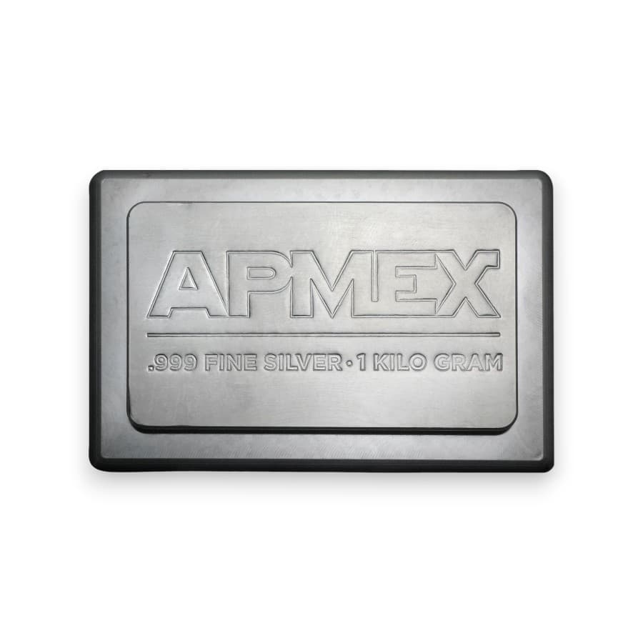 The 1 Kilo Apmex Silver Bar Stacker, crafted in .999 fine silver, is a substantial and practical investment product designed for both ease of storage and high value. Weighing 1 kilogram (approximately 32.15 troy ounces), this bar features a sleek and stackable design with beveled edges, allowing for secure and efficient stacking. The obverse of the bar prominently displays the APMEX logo, along with the weight and purity specifications, ensuring transparency and trust. The reverse side typically includes a repeating pattern or the APMEX logo for added security and authenticity. Produced to high-quality standards, this silver bar guarantees consistent weight and purity, making it a dependable choice for investors and collectors looking to add a significant amount of silver to their portfolios. Its large size, high silver content, and practical design make the 1 Kilo Apmex Silver Bar Stacker a valuable addition to any precious metals collection.