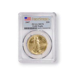 The 1 oz American Gold Eagle Coin, authenticated and certified by the Professional Coin Grading Service (PCGS), showcases the fusion of American heritage with the United States Mint's exceptional craftsmanship. Struck in 22K gold, with a purity of .9167, this coin features the enduring design of Augustus Saint-Gaudens' 1907 Double Eagle on its obverse, depicting Lady Liberty in a dynamic forward stride against a backdrop of sun rays. The reverse, designed by Miley Busiek, presents a heartwarming scene of a male eagle returning to its nest, where a female eagle and their eaglet await. The coin's "Random Date" specification implies that while its quality and authenticity are validated by PCGS, the actual year of minting might vary. Embracing both numismatic significance and tangible investment value, the 1 oz American Gold Eagle is a sought-after asset among collectors and investors alike.