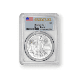 The 1 oz American Silver Eagle coin is among the most popular silver bullion coins in the world. The "First Strike" designation by the Professional Coin Grading Service (PCGS) indicates that the coin was received for grading within the first 30 days of its release from the mint. These coins are highly sought after by investors and collectors alike for their .999 fine silver content, iconic design, and PCGS certification, which adds an extra layer of credibility and collection appeal. Although the date on each coin is random, each features the classic Walking Liberty design by Adolph A. Weinman on the obverse and John Mercanti's heraldic eagle on the reverse, symbolizing American freedom and pride.