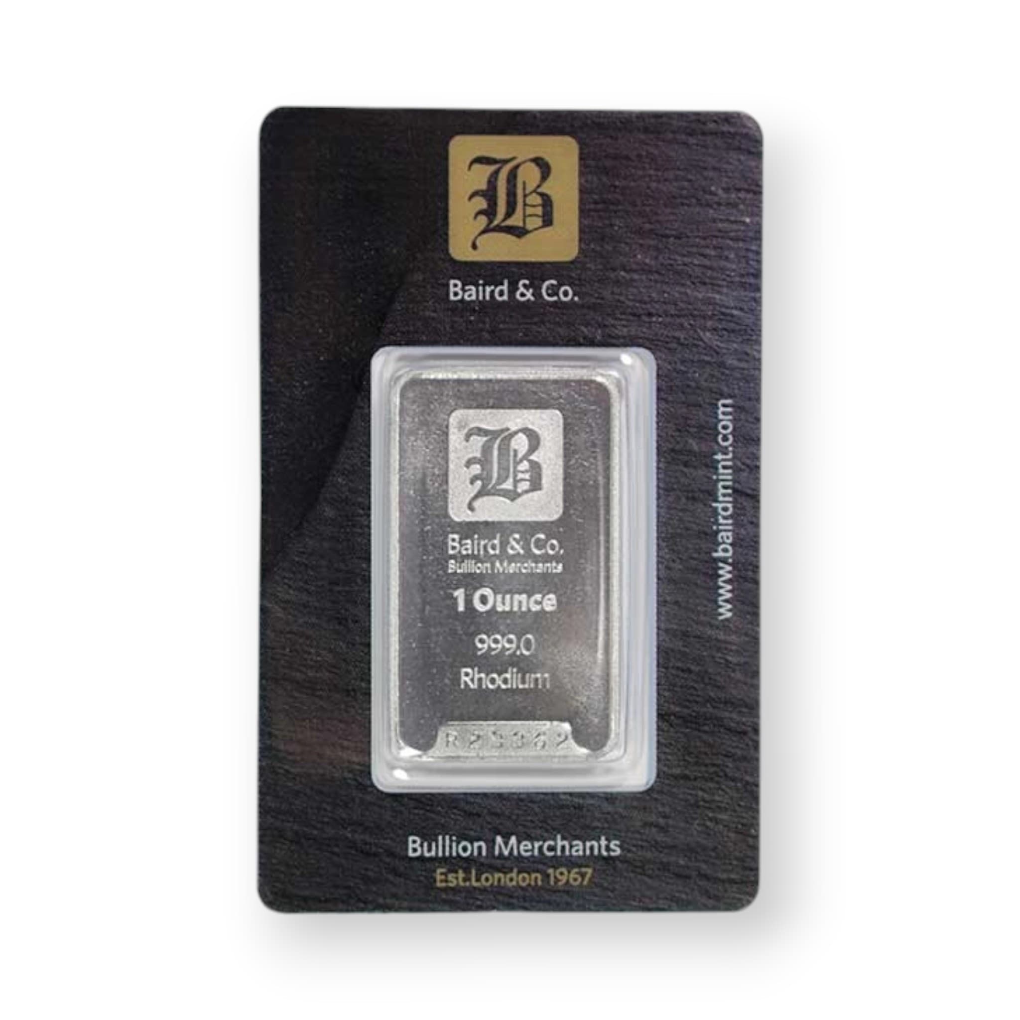 The 1 oz Baird & Co. Rhodium Bar .999 Fine is a premium investment-grade bullion product, crafted by Baird & Co., a renowned British refinery. Composed of 99.9% pure rhodium, one of the rarest and most valuable precious metals, this bar is highly sought after for its investment potential and industrial applications, particularly in the automotive and chemical industries. Each bar comes securely sealed in an assay card, ensuring authenticity and quality. Due to rhodium's price volatility and limited availability, these bars are a strategic choice for investors looking to diversify their portfolios with ultra-rare precious metals.