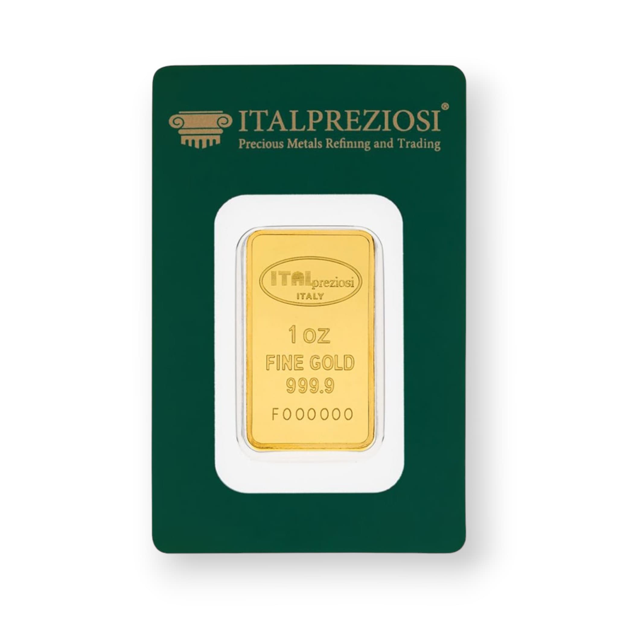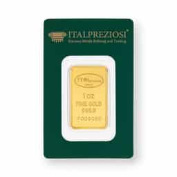The 1 oz Gold Bar Italpreziosi is a distinguished investment product, minted in .9999 fine gold and weighing 1 troy ounce (approximately 31.1035 grams). Produced by Italpreziosi, a reputable Italian precious metals refiner, this gold bar is known for its high quality and purity. The obverse of the bar typically features the Italpreziosi logo, along with weight and purity specifications. The reverse side often includes a unique serial number for added security. Each bar is sealed in a tamper-evident carded assay, which certifies its authenticity and gold content, ensuring the bar's integrity and providing peace of mind to investors. The combination of Italpreziosi's trusted reputation, the high gold purity, and the secure packaging makes this 1 oz gold bar a valuable addition to any investment portfolio or precious metals collection.