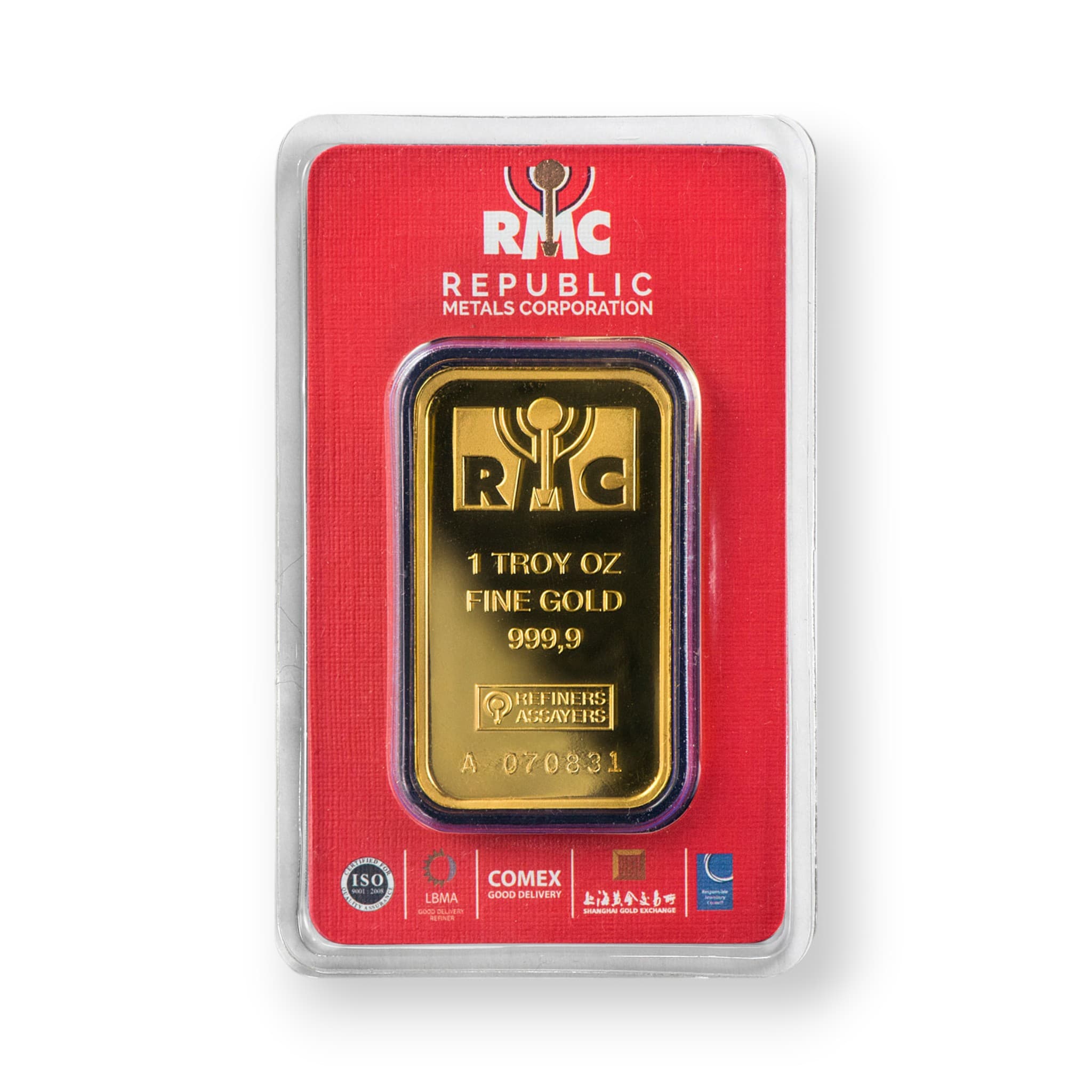 The 1 oz Gold Bar from Republic Metals Corporation (RMC) is a premium investment-grade bullion product. Each bar is crafted from .9999 fine gold, ensuring the highest purity and quality. The gold bar comes securely sealed in a tamper-evident assay card, which includes a unique serial number and assay details, guaranteeing the bar's authenticity and weight. RMC, a trusted name in precious metals, manufactures these gold bars using state-of-the-art techniques, making them an ideal choice for investors and collectors alike. With its compact size and portability, this 1 oz gold bar is a convenient way to diversify your portfolio and protect your wealth.