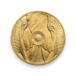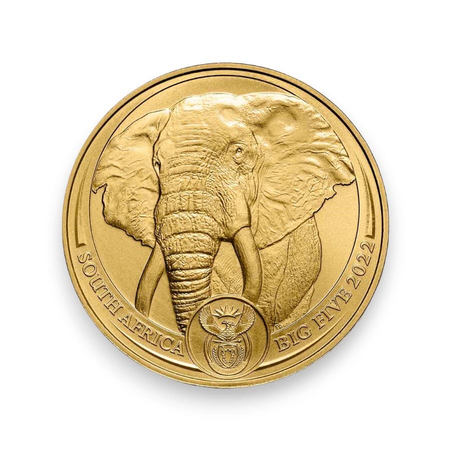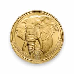 The 1 oz Gold South African Big 5 Elephant 50 Rand Gold Coin, struck with a .9999 fine gold purity, is a magnificent tribute to Africa's majestic wildlife, specifically celebrating the elephant, one of the continent's most iconic and revered animals. Part of the South African Mint's "Big 5" series, this coin showcases the elephant in exquisite detail, capturing the essence and grandeur of this magnificent creature. The series is named after the "Big 5" game animals of Africa: the elephant, lion, buffalo, leopard, and rhinoceros, each celebrated for their majesty and the conservation efforts to protect them. The obverse of the coin typically features the South African Coat of Arms, symbolizing the unity and pride of the nation, while the reverse is graced with a stunning depiction of the elephant, highlighting its strength, wisdom, and serene beauty. Issued in random dates, the coin carries a denomination of 50 Rand, confirming its legal tender status in South Africa. Collectors and investors alike prize the 1 oz Gold Big 5 Elephant coin not only for its investment value, given its high gold purity, but also for its contribution to wildlife conservation awareness and the celebration of African heritage, making it a sought-after piece in the world of precious metals.