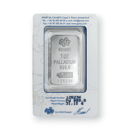 The 1 oz Palladium Pamp Bar featuring the Fortuna design, with a .9995 fine purity and sealed in an assay card, is a notable offering from PAMP Suisse, a leader in the precious metals industry. This bar contains one ounce of palladium, a rare and valuable metal, and boasts an exceptional purity level of 99.95%. The Fortuna design, a hallmark of PAMP Suisse, depicts the Roman goddess of fortune, representing luck and prosperity, and is acclaimed for its intricate and artistic detailing. Enclosed in a tamper-evident assay card, the bar is not only protected but also authenticated. The assay card serves as a certificate of authenticity, detailing the bar's weight, high purity, and providing a unique serial number for added security and verification. The 1 oz Palladium Pamp Bar with the Fortuna design is highly prized in the precious metals market for its combination of fine craftsmanship, the rarity of palladium, and the trusted reputation of PAMP Suisse, making it a desirable choice for investors and collectors.