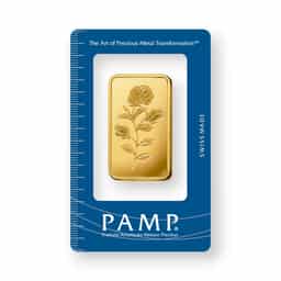 The 1 oz PAMP Rosa Gold Bar, minted with a .9999 fine gold purity, exemplifies the pinnacle of Swiss craftsmanship and design, sealed within a carded assay for utmost authenticity and quality assurance. This exquisite bar features the renowned Rosa design, a symbol of elegance and purity, with a beautifully detailed rose that appeals to collectors and investors seeking both aesthetic beauty and tangible value. PAMP Suisse, a leading name in the precious metals industry, ensures each Rosa gold bar is a testament to their commitment to excellence, combining artistry with the highest standards of minting. The tamper-evident assay packaging provides essential details, including the bar's weight, purity, and a unique serial number, offering an added layer of security and trust. Ideal for both seasoned precious metal enthusiasts and those looking to commemorate special occasions, the 1 oz PAMP Rosa Gold Bar is a sought-after piece for its blend of investment appeal, collectible beauty, and the symbol of love and luxury it represents, making it a cherished addition to any collection or investment portfolio.