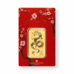The 1 oz Perth Mint Lunar Dragon Gold Bar is a premium investment product, minted in .9999 fine gold and weighing approximately 31.1035 grams. Part of the prestigious Perth Mint Lunar series, this bar features a detailed depiction of the Lunar Dragon, symbolizing strength and good fortune. The obverse displays the Perth Mint logo, along with the bar's weight and purity. Each bar is sealed in a tamper-evident carded assay, ensuring its authenticity and gold content. The combination of the Perth Mint's exceptional craftsmanship, high gold purity, and culturally significant Lunar Dragon design makes this bar a valuable addition to any collection or investment portfolio.