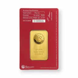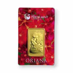 The 1 oz Perth Mint Oriana Gold Bar is a distinguished investment product, meticulously minted in .9999 fine gold and weighing 1 troy ounce (approximately 31.1035 grams). The reverse side of the bar features the elegant and graceful image of Oriana, a symbol of beauty and purity, rendered with exquisite detail. The obverse displays the prestigious Perth Mint logo, along with the bar's weight and purity specifications, underscoring the mint's commitment to quality and authenticity. Each bar is securely sealed in a tamper-evident carded assay, providing an added layer of security and certifying the bar's authenticity and gold content. The exceptional craftsmanship of the Perth Mint, combined with the high purity of the gold and the artistic depiction of Oriana, makes this gold bar a valuable and desirable addition to any collection or investment portfolio. Its aesthetic appeal and assured quality enhance its attractiveness to both collectors and investors.