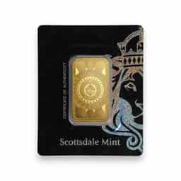 The 1 oz Scottsdale Gold Bar, crafted in .9999 fine gold, represents the pinnacle of quality and purity in precious metal investment. Produced by Scottsdale Mint, a name synonymous with excellence and trust, this gold bar features a sleek and elegant design. The front of the bar typically displays the renowned Scottsdale Mint lion logo, along with inscriptions indicating the bar's weight and gold purity. The reverse side may include a repeating pattern or additional branding elements. Each bar is securely sealed in a carded assay, which certifies its authenticity and guarantees the gold content. The assay card provides an added layer of security and tamper-evidence, ensuring peace of mind for investors. Weighing 1 troy ounce, or approximately 31.1035 grams, the 1 oz Scottsdale Gold Bar is an excellent choice for those looking to add high-purity gold to their investment portfolio. Its combination of superior craftsmanship, high gold content, and secure packaging makes it a valuable and trusted asset for collectors and investors alike.