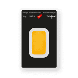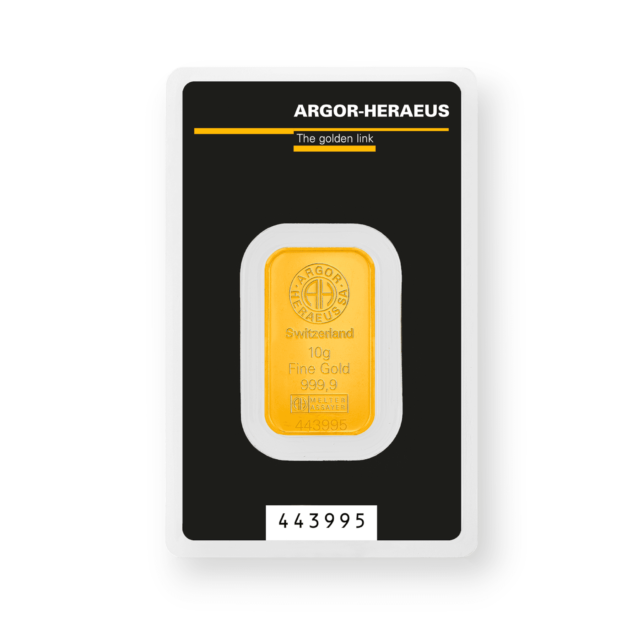 The 10 Gram Argor Heraeus Gold Bar, with a .9999 fine purity and sealed within a carded assay, is a refined product from the renowned Swiss refinery Argor Heraeus. This bar contains 10 grams of 99.99% pure gold, showcasing the high standards of quality Argor Heraeus is known for. The bar is encased in a tamper-evident assay card, which not only ensures the bar's protection but also certifies its authenticity, detailing crucial information such as the bar's weight, purity, and a unique serial number. This level of purity and the trusted reputation of Argor Heraeus make the 10 Gram Gold Bar a popular choice for investors and collectors, offering a balance between a substantial amount of gold and the convenience of a smaller, easily tradable size.