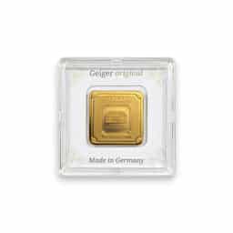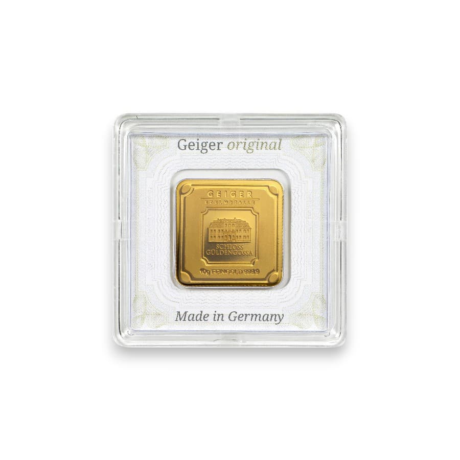 The 10 Gram Gold Geiger Original Bar exemplifies the pinnacle of precious metal refinement and security, minted by the esteemed Geiger Edelmetalle AG with a .9999 fine gold purity. Each bar is meticulously sealed within a carded assay, providing a comprehensive verification of its authenticity, weight, and purity. This not only ensures the integrity of the investment but also enhances its collectible value. The bar features the iconic design synonymous with Geiger Edelmetalle, including the depiction of Schloss Güldengossa, emblematic of Geiger's rich heritage and commitment to excellence in the precious metals industry. Advanced security measures, such as UV-light-readable elements and a unique serial number on the assay card, are integral to the bar, setting it apart in terms of investment security and trust. The 10 Gram Gold Geiger Original Bar is a sought-after asset among investors and collectors alike, who value both the tangible wealth of fine gold and the assurance of owning a product from one of the world's leading refineries, known for its innovative approach to precious metal security and authenticity.