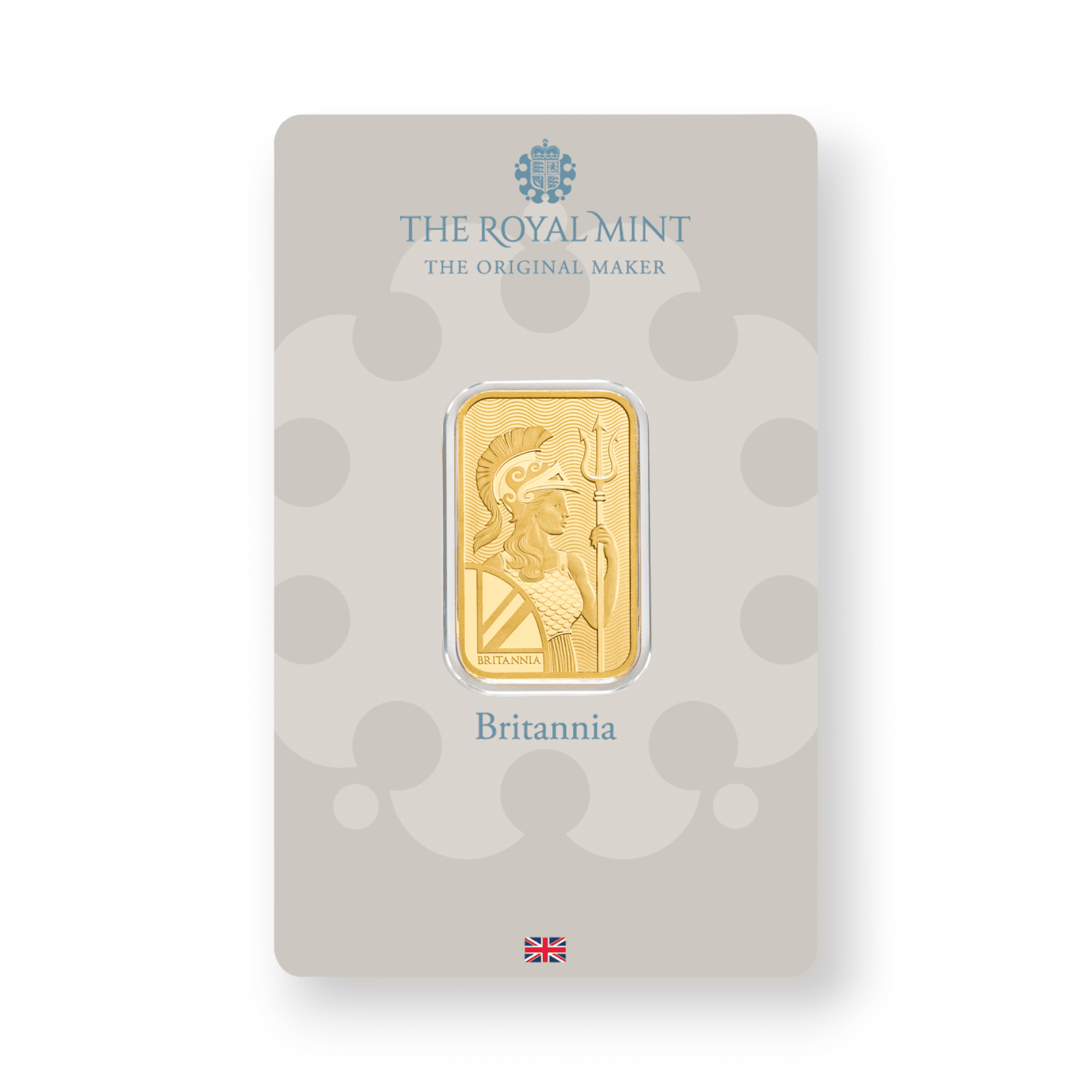 The 10 Gram Royal Mint Britannia Gold Bar, featuring a .9999 fine purity and sealed in an assay card, is a distinguished offering from the Royal Mint, one of the most reputable mints in the world. This bar contains 10 grams of gold with an exceptionally high purity of 99.99%, showcasing the Royal Mint's commitment to producing premium gold products. The design of the bar typically features Britannia, a classic symbol of British heritage and strength, enhancing its collectible and aesthetic appeal. Enclosed in a tamper-evident assay card, the gold bar is both protected and authenticated, with the card providing vital details such as the bar's weight, purity, and a unique serial number for verification and security. The 10 Gram Royal Mint Britannia Gold Bar is highly prized in the precious metals market for its significant gold content, exceptional purity, and the storied legacy of the Royal Mint, making it an attractive investment for both collectors and those seeking to diversify their portfolio with high-quality gold.