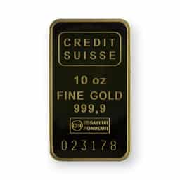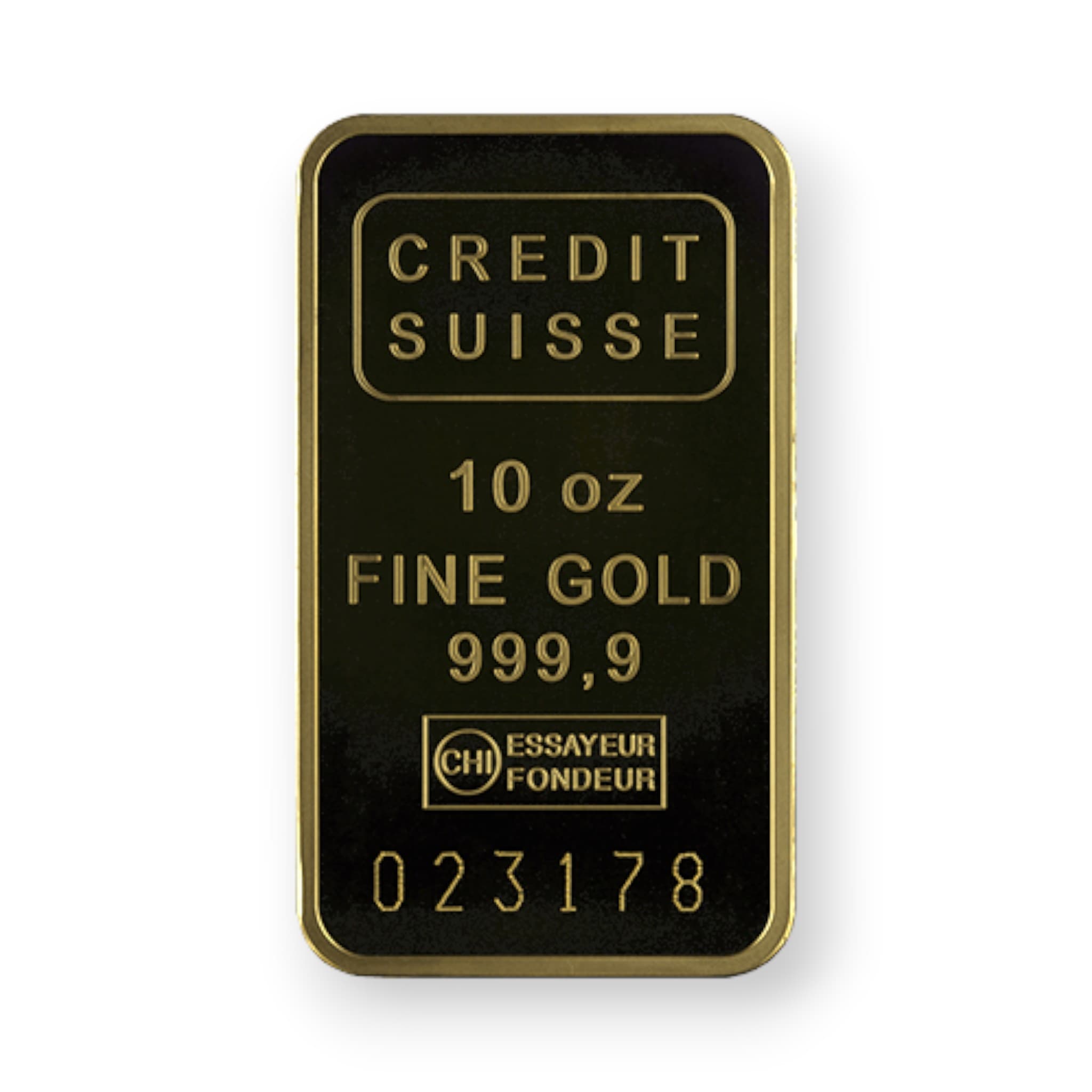 The 10 oz Credit Suisse Gold Bar is a premium investment product, meticulously crafted in .9999 fine gold. Weighing 10 troy ounces (approximately 311.035 grams), this gold bar is produced by Credit Suisse, one of the most reputable names in the precious metals industry. The obverse of the bar features the Credit Suisse logo, along with the weight, purity, and unique serial number, ensuring authenticity and traceability. The reverse side typically showcases a simple, repeating logo pattern. Each bar is sealed in a tamper-evident assay card, which certifies its gold content and purity, providing an additional layer of security and assurance for investors. The high gold purity, combined with the trusted Credit Suisse brand, makes this 10 oz gold bar a valuable addition to any investment portfolio or precious metals collection.