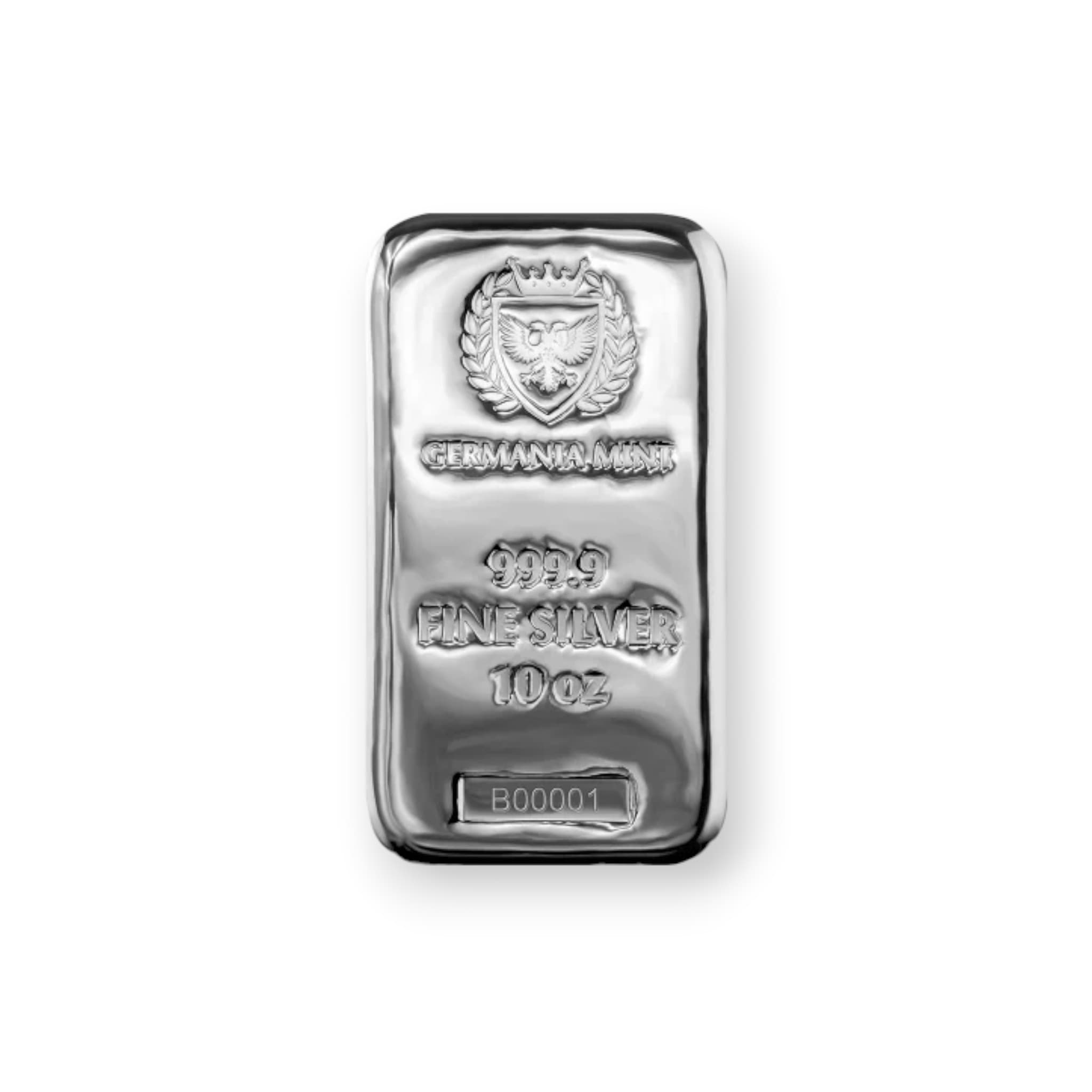The 10 oz Germania Mint .9999 Fine Silver Bar is a high-quality silver bullion product crafted by the renowned Germania Mint. Each bar is made from .9999 fine silver, ensuring exceptional purity and value. Weighing precisely 10 troy ounces, these bars feature a sleek and modern design, with the Germania Mint logo prominently displayed on the obverse side, along with the bar's weight and purity. The reverse side showcases a unique security feature, adding an extra layer of protection against counterfeiting. These silver bars are an excellent choice for investors and collectors seeking to diversify their precious metals portfolio with a trusted and visually appealing product from a reputable mint.