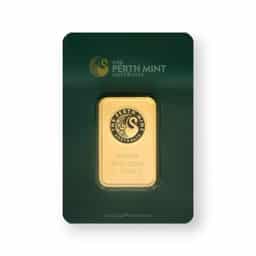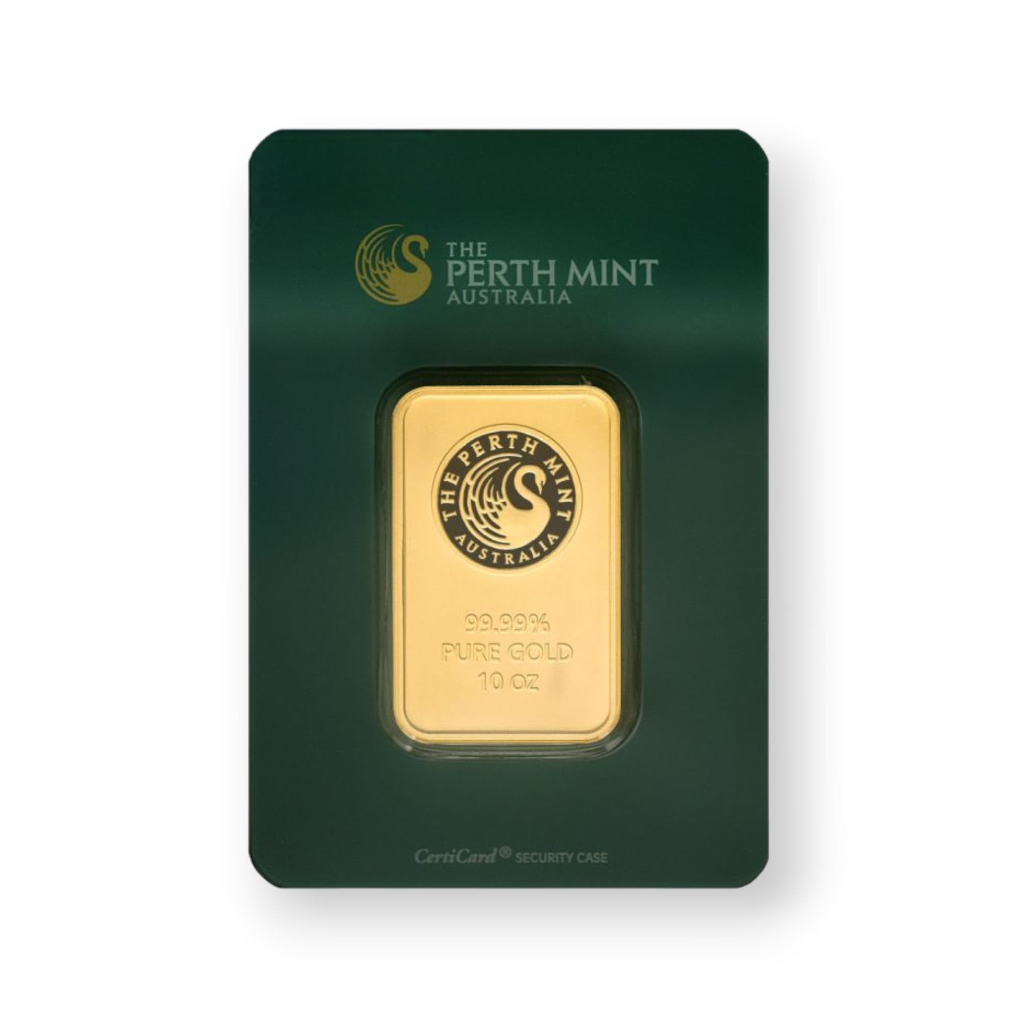 The 10 oz Gold Perth Mint .9999 Fine Bar is a high-quality gold bullion product from the renowned Perth Mint in Australia. Each bar is made from 99.99% pure gold, ensuring its value and authenticity. The bar comes sealed in a protective assay card, which displays the bar's unique serial number, weight, and purity. The obverse of the bar features the iconic Perth Mint logo, while the reverse showcases a stylized kangaroo design. This 10 oz gold bar is an excellent choice for investors seeking to diversify their portfolio with a trusted and recognized gold bullion product.
