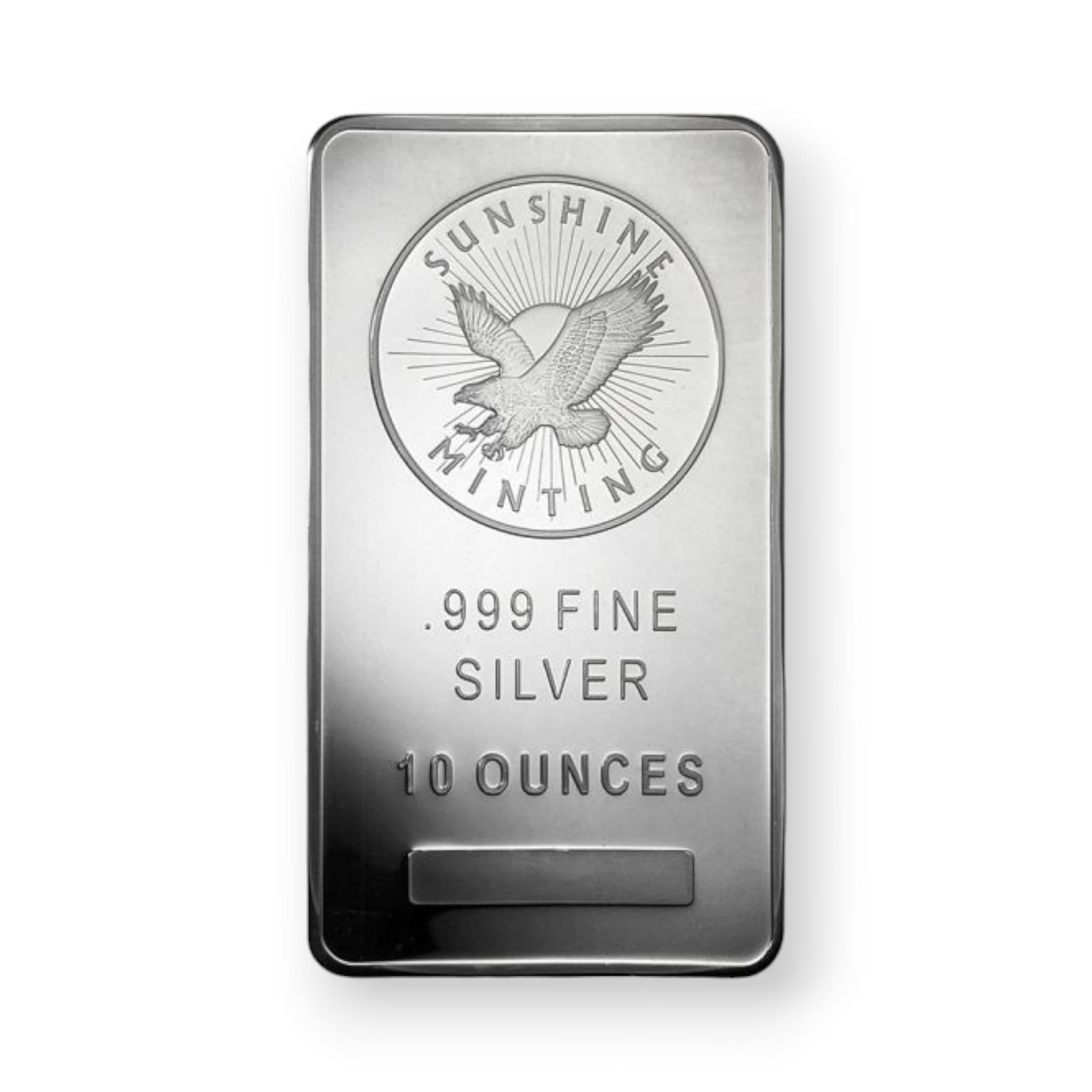 The 10 oz Silver Bar Sunshine Mint .999 Fine is a highly sought-after precious metal product from the renowned Sunshine Minting Inc. This bar boasts a stunning design featuring the iconic Sunshine Mint logo and intricate radial sunburst patterns on both sides. Crafted from .999 fine silver, which is the highest purity level for investment-grade silver, this bar guarantees exceptional quality and value. Measuring approximately 3.15 inches in length, 1.18 inches in width, and 0.37 inches in thickness, it offers a substantial weight and size that appeals to both collectors and investors alike. The bar's sleek and polished finish adds to its visual appeal, while the precise weight and purity markings ensure transparency and authenticity. Whether you're diversifying your investment portfolio or building a precious metal collection, the 10 oz Silver Bar Sunshine Mint .999 Fine is an excellent choice that combines beauty, quality, and enduring value.