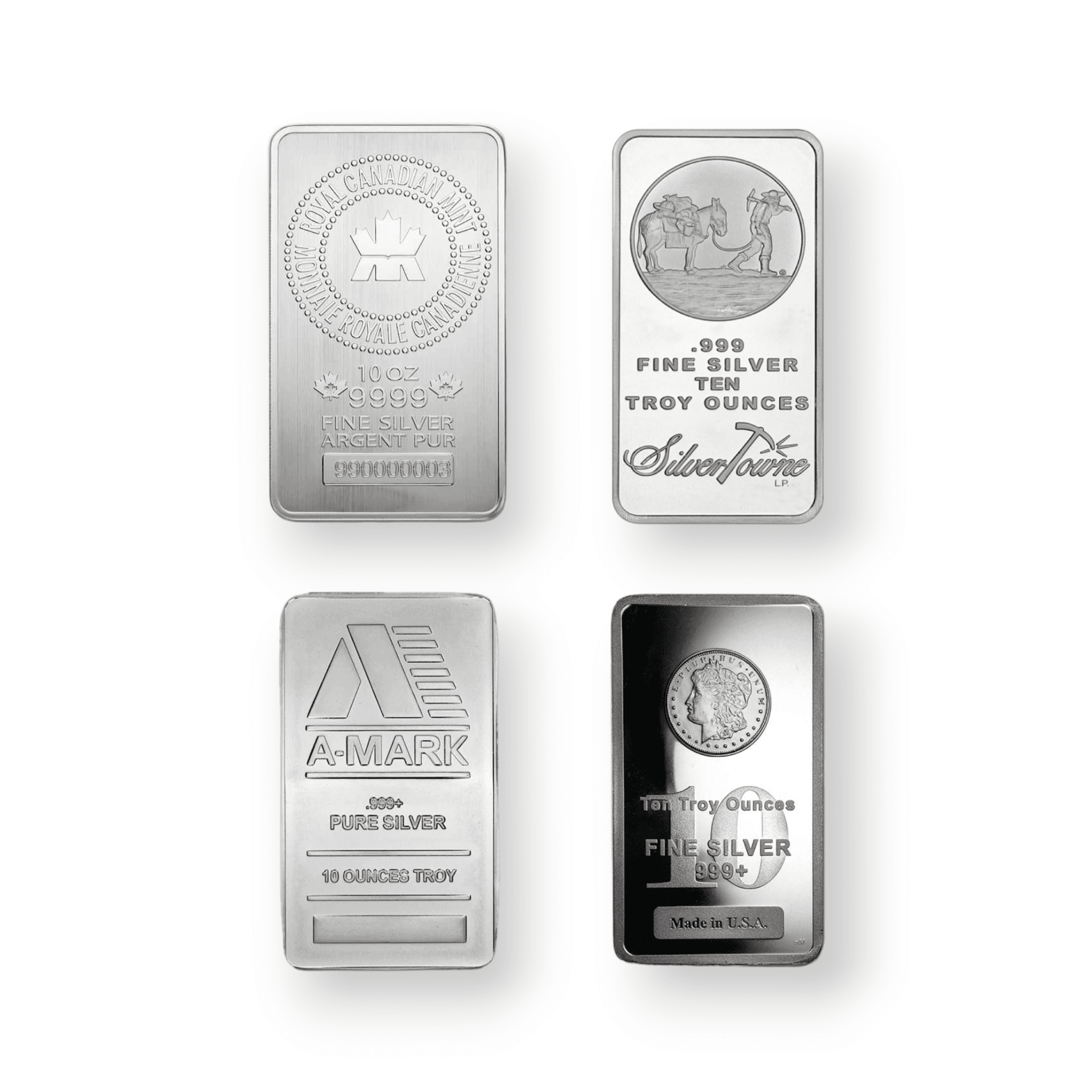 "10 oz Silver Bars .999 Fine Accredited Brands" represent a significant investment in silver, consisting of 10-ounce silver bars with a purity of 99.9%. These bars are typically produced by well-established and accredited precious metals manufacturers known for their commitment to strict quality and purity standards. They are widely recognized and trusted within the industry and often carry endorsements from organizations like the LBMA (London Bullion Market Association). These bars may also be accepted on various commodity exchanges, attesting to their authenticity, purity, and quality. As a favored choice among investors and collectors, these bars provide a reliable means to invest in physical silver that adheres to the highest standards of the global precious metals market.