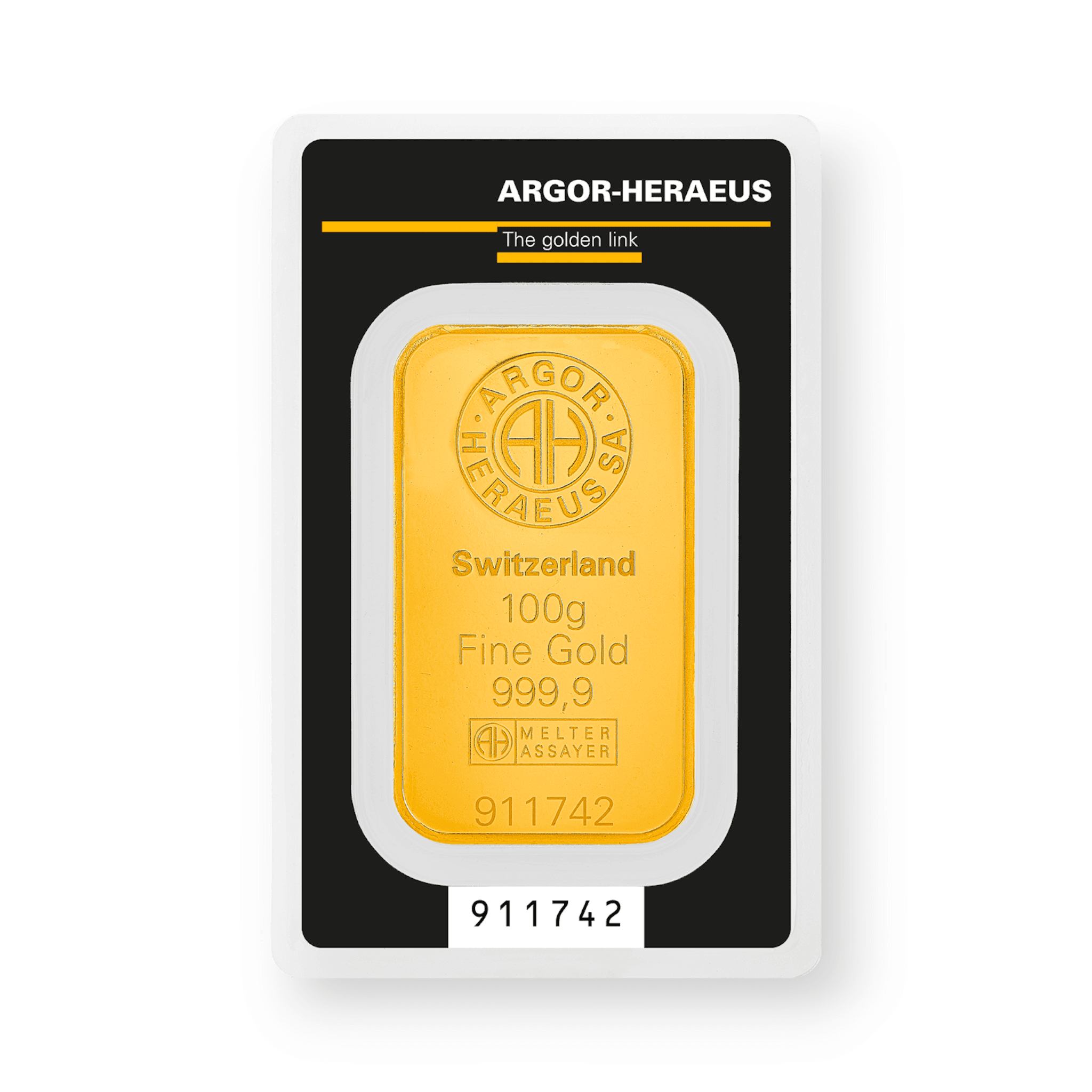 The 100 Gram Argor Heraeus Gold Bar, featuring .9999 fine purity and sealed within a carded assay, is a significant and high-quality offering from the renowned Swiss refinery, Argor Heraeus. This substantial bar contains 100 grams of 99.99% pure gold, embodying the refinery's commitment to excellence in precious metal processing. Securely encased in a tamper-evident assay card, the bar is not only protected but also authenticated. The card provides key details such as the bar's weight, its exceptional level of purity, and a unique serial number for added security and verification. This 100 Gram Gold Bar is particularly valued by serious investors and collectors for its sizeable gold content, the trust and prestige associated with the Argor Heraeus brand, and the assurance of authenticity provided by the carded assay.