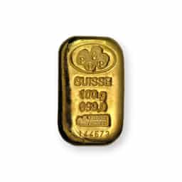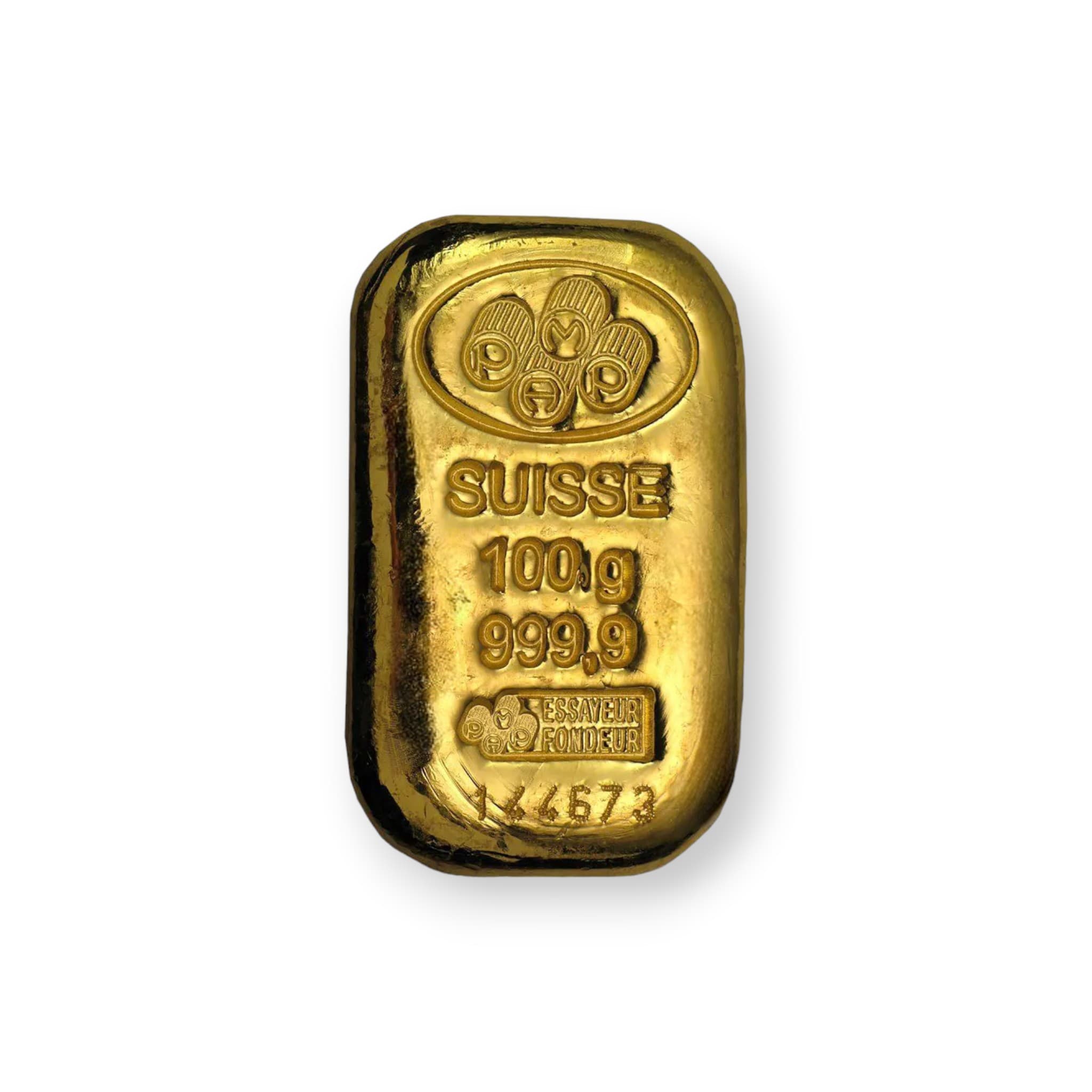 The 100 Gram Cast Gold Pamp Suisse Bar is a premium gold bullion product manufactured by the renowned Swiss refinery, Pamp Suisse. Each bar is crafted from 99.99% pure gold, ensuring the highest level of purity and quality. Weighing precisely 100 grams, this cast gold bar features a distinctive design that showcases the iconic Pamp Suisse logo and the bar's weight and purity. The bar comes with an assay card, which serves as a certificate of authenticity, verifying the bar's weight, purity, and unique serial number. This combination of high purity, trusted refinery, and included assay card makes the 100 Gram Cast Gold Pamp Suisse Bar an attractive choice for investors and collectors seeking to diversify their precious metals portfolio with a reliable and recognized gold bullion product.