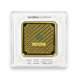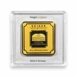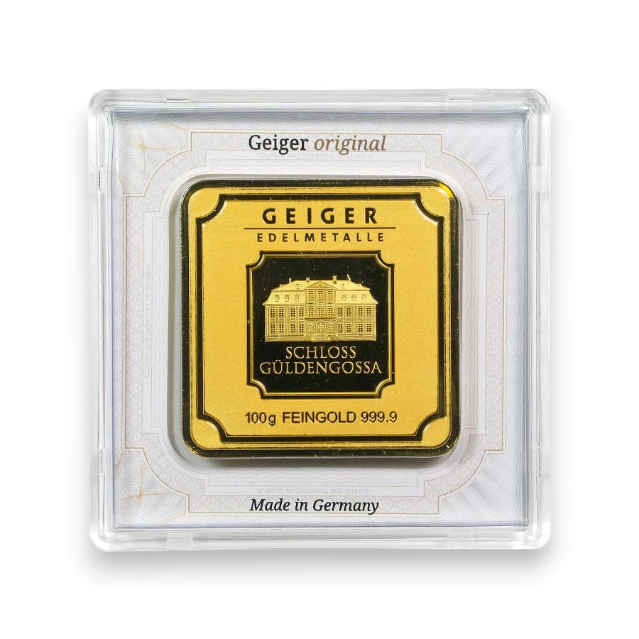 The 100 Gram Gold Geiger Original Bar, sealed in a carded assay with a .9999 fine gold purity, epitomizes the blend of tradition, innovation, and security that Geiger Edelmetalle AG is renowned for. Minted in Germany, this bar features advanced security elements, including UV-light-readable markings and a serialized hologram on the assay card, ensuring authenticity and protection for investors. The bar's design elegantly showcases the Geiger Edelmetalle logo alongside the iconic image of Schloss Güldengossa, reflecting the company's rich heritage and commitment to quality. These gold bars are highly prized by both collectors and investors, not only for their pure gold content and the investment value they represent but also for their exquisite craftsmanship and the assurance of security and authenticity provided by one of the most respected names in the precious metals industry.