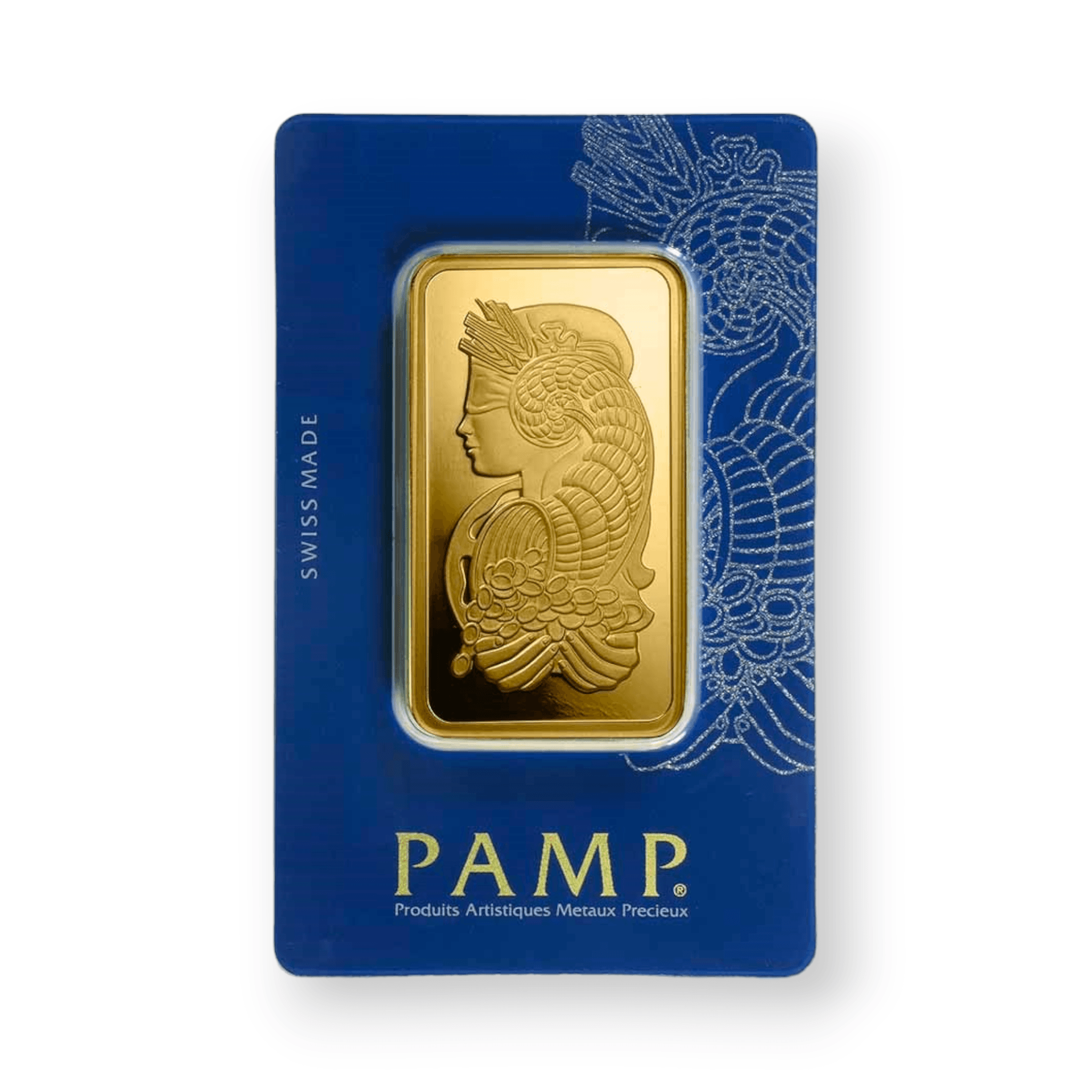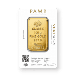 The 100 Gram Pamp Gold Bar, sealed in an assay card with a .9999 fine purity, represents a substantial investment in high-quality gold from PAMP Suisse, one of the most respected names in the precious metals industry. This bar contains 100 grams of 99.99% pure gold, showcasing the exceptional standard of purity that PAMP Suisse is known for. The bar often features PAMP's signature design elements, which can include intricate artistic motifs or cultural symbols, enhancing its aesthetic appeal. Each bar is encased in a tamper-evident assay card that not only provides protection but also serves as a certificate of authenticity. This card includes important details like the bar's weight, its ultra-high level of purity, and a unique serial number, essential for verification and security. The 100 Gram Pamp Gold Bar is highly sought after by serious investors and collectors, offering a significant quantity of high-purity gold combined with the prestige and reliability of the PAMP Suisse brand.