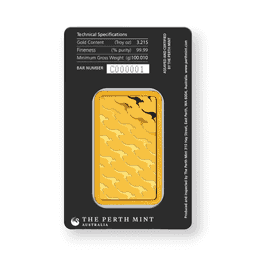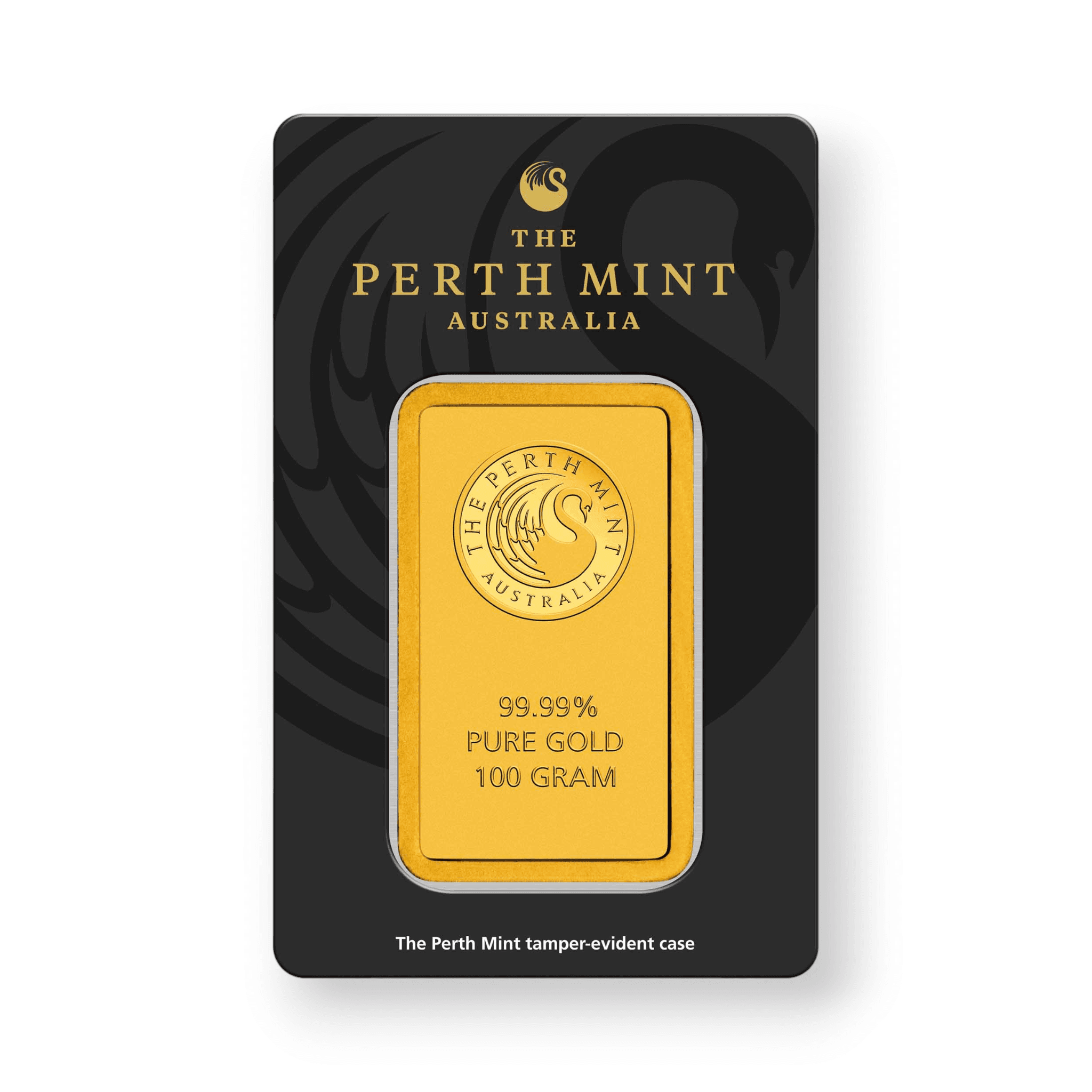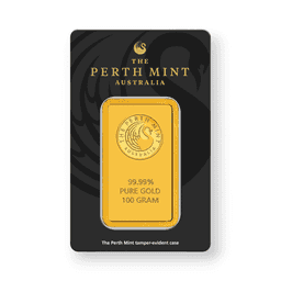The 100 Gram Perth Mint Gold Bar, sealed in an assay card with a .9999 fine purity, is a notable and prestigious offering from the Perth Mint, renowned for its exceptional minting quality. This substantial gold bar contains 100 grams of 99.99% pure gold, showcasing the Perth Mint's expertise in producing high-purity gold products. The bar typically features the mint's signature design elements, such as the iconic Perth Mint logo or Australian cultural motifs, enhancing its aesthetic and collectible appeal. Encased in a tamper-evident assay card, the bar is both protected and authenticated, with the card providing important information such as the bar's weight, its ultra-high level of purity, and a unique serial number for verification and security purposes. This 100 Gram Perth Mint Gold Bar is highly sought after in the precious metals market, appealing to investors and collectors who value the combination of significant gold content, the exceptional purity, and the prestige associated with the Perth Mint.