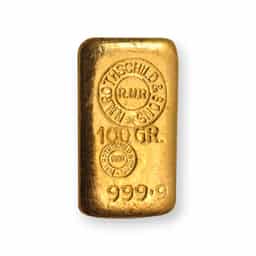 The 100 Gram Rothschild & Sons Gold Bar Vintage is a prestigious investment piece, celebrated for its historical significance and impeccable craftsmanship. Minted in .9999 fine gold, this bar weighs 100 grams (approximately 3.215 troy ounces), ensuring a substantial addition to any precious metals portfolio. The bar features a classic rectangular design, with the Rothschild & Sons logo prominently stamped on the obverse, alongside weight and purity details. This vintage gold bar reflects the long-standing legacy and esteemed reputation of Rothschild & Sons in the global precious metals market. Collectors and investors highly value this gold bar for its high purity, historical appeal, and the distinguished Rothschild name. The 100 Gram Rothschild & Sons Gold Bar is an excellent addition to any collection or investment portfolio, offering a blend of historical charm and guaranteed quality.