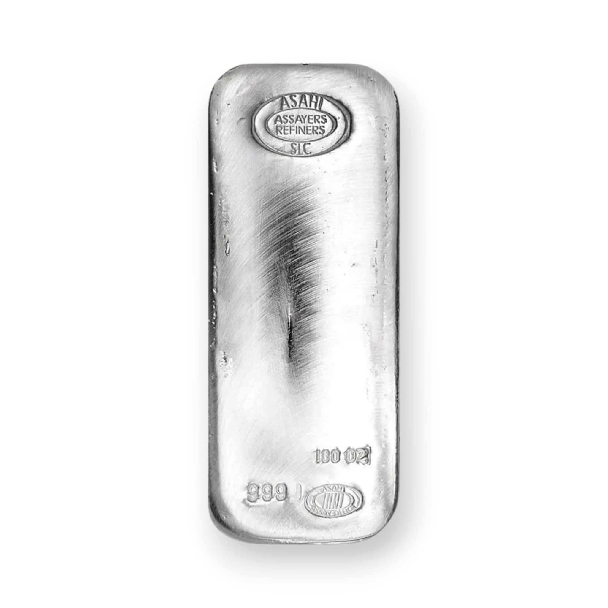 The 100 oz Asahi Silver Bar .999 Fine is a substantial investment-grade bullion product produced by Asahi Refining. Known for their high-quality standards, Asahi Refining took over Johnson Matthey's refining operations and has continued the legacy of producing exceptional precious metal products. This silver bar is crafted from 100 troy ounces of .999 fine silver, making it a reliable and valuable asset for both investors and collectors. The bar features a simple yet elegant design, typically stamped with the Asahi logo, the weight, purity, and a unique serial number for verification and added security. Due to its large size and high purity, the 100 oz Asahi Silver Bar is particularly favored by serious investors seeking to add bulk silver to their portfolios at a relatively low premium over the spot price of silver.
