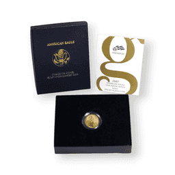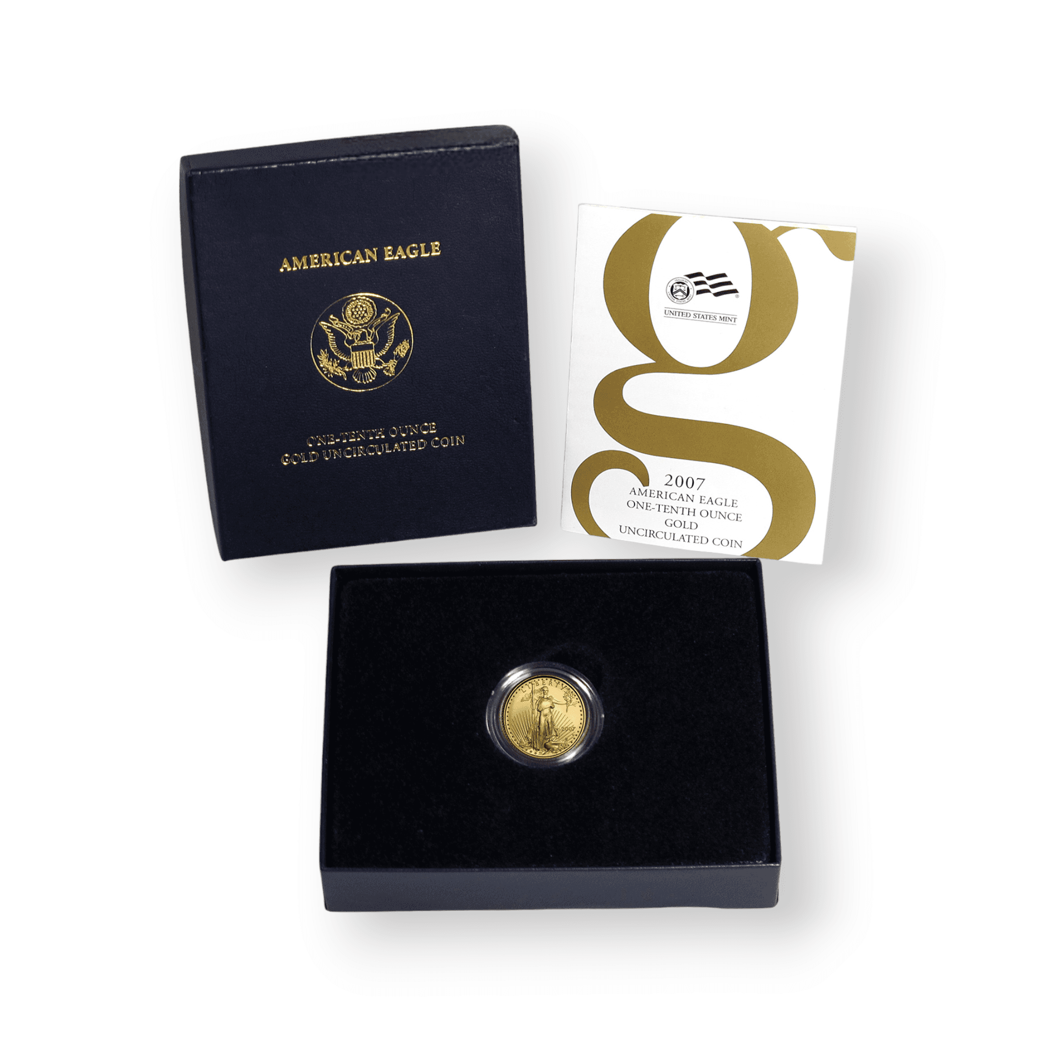 The 1/10 oz Burnished American Gold Eagle is a smaller version of the prestigious American Gold Eagle series, which is sought after by both collectors and investors. This particular coin comes with a face value of $5 and is presented as a special burnished version, giving it a distinctive matte-like finish that differs from the standard bullion coin's luster. The "with Box & COA" means that the coin is accompanied by its original government packaging and a Certificate of Authenticity, ensuring its authenticity and quality. As a random date offering, the exact year of the coin you receive is not specified beforehand, adding an element of surprise for collectors.