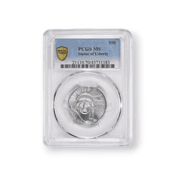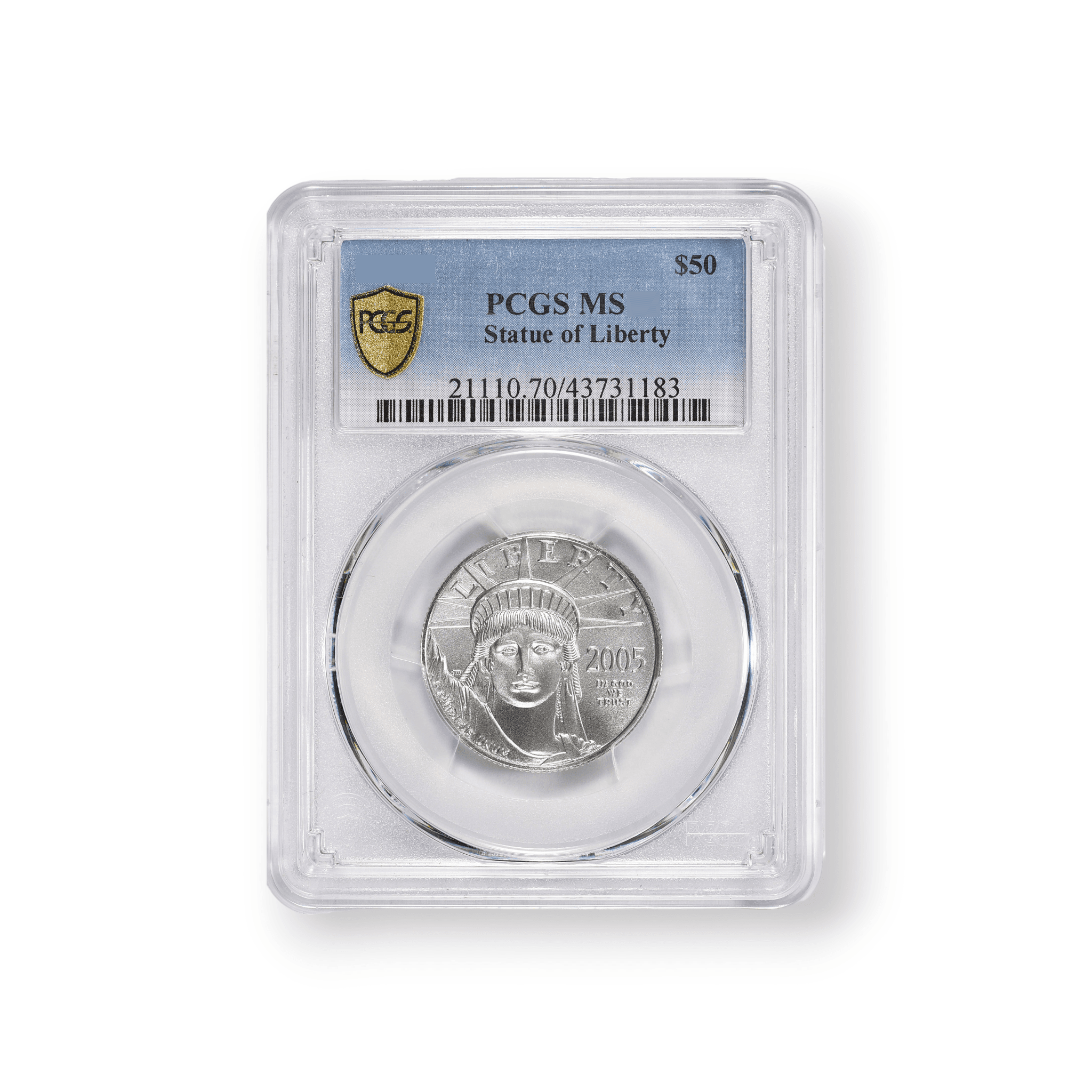 The 1/2 oz American Platinum Eagle $50 coin is a prestigious piece of United States bullion that has been produced by the U.S. Mint since its debut in 1997. As a coin struck from .9995 pure Platinum, it contains half an ounce of this valuable precious metal. When graded and certified by the Professional Coin Grading Service (PCGS), they are encased in a protective slab to preserve their condition and authenticate their quality. The year of issue for these coins can vary, which is indicated by the term "Random Date," meaning buyers receive a coin from any year of mintage based on availability. The obverse of the coin typically features the Statue of Liberty’s face, while the reverse has varied designs across the series, changing annually from 1998 to 2017 and showcasing different themes representing American ideals and icons.