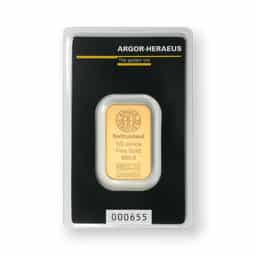 The 1/2 oz Gold Bar Argor Heraeus is a high-quality investment-grade gold product. Crafted by the renowned Swiss refinery Argor-Heraeus, this bar is composed of 99.9% pure gold, ensuring its exceptional fineness and purity. Sealed in a tamper-evident assay card, the bar's authenticity and weight are guaranteed. With a weight of precisely 0.5 troy ounces, this gold bar offers a convenient size for both investors and collectors seeking to diversify their precious metal holdings. The Argor-Heraeus brand is widely recognized for its adherence to strict quality standards, making this gold bar a reliable and trusted choice in the bullion market.
