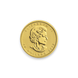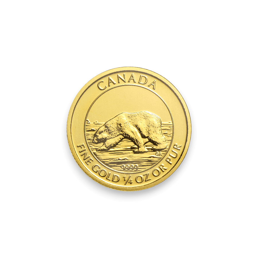The 2013 1/4 oz Canadian Polar Bear .9999 Fine Gold Coin is a notable and sought-after collectible in the precious metals market. Minted by the Royal Canadian Mint, this coin is composed of a quarter ounce of exceptionally pure gold, boasting a fineness of 99.99%. The coin's design features a striking image of a polar bear, a powerful symbol of Canada's Arctic wilderness, showcasing the animal in a detailed and lifelike manner. This 2013 edition is part of a series celebrating Canada's rich wildlife, and its specific year of issue enhances its appeal to collectors and investors. The coin's high gold purity, coupled with its artistic representation of one of Canada's most iconic creatures, makes it an attractive investment for both its numismatic value and its precious metal content.