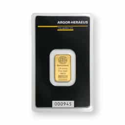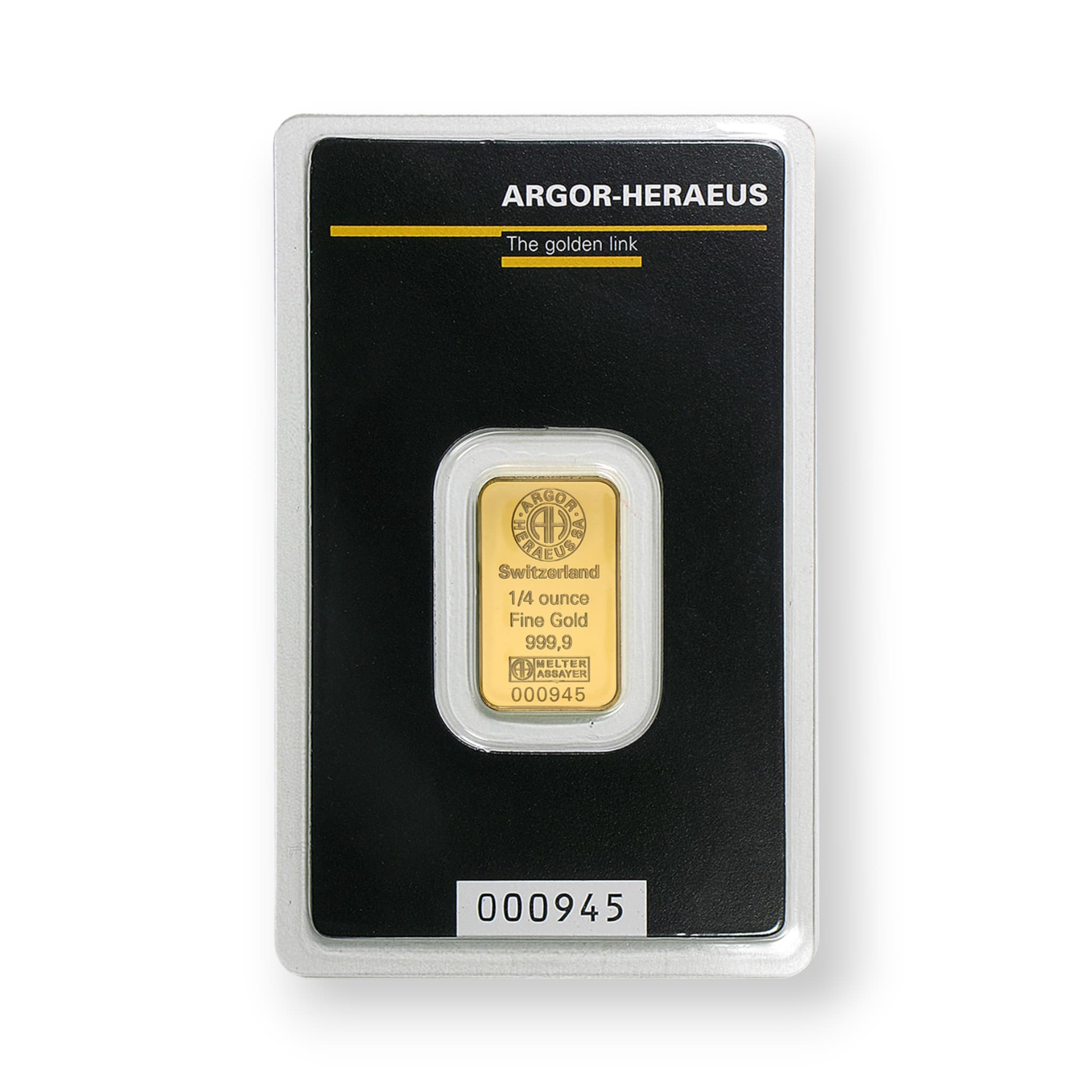 The 1/4 oz Gold Bar Argor Heraeus is a high-quality investment-grade gold bar. Crafted by the renowned Swiss refinery Argor-Heraeus, this bar is composed of 99.9% pure gold, ensuring its exceptional purity and value. Measuring approximately 1.5 inches in length, 0.75 inches in width, and 0.1 inches in thickness, this compact bar weighs precisely 0.25 troy ounces. It comes sealed in a tamper-evident assay card, which guarantees its authenticity and provides detailed information about the bar's weight, purity, and serial number. With its recognized brand, precise weight, and sealed packaging, the 1/4 oz Gold Bar Argor Heraeus offers a reliable and convenient way to invest in or hold physical gold.