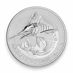 The 1.5 oz Australian Silver Striped Marlin coin, minted by the Perth Mint with a .9999 fine silver purity, represents a stunning tribute to the vibrant marine life surrounding Australia. Part of a series dedicated to showcasing the country's rich biodiversity, this coin features the striped marlin, known for its speed and the distinctive stripes that adorn its body, capturing the essence of this majestic sea creature in striking detail. The Perth Mint, renowned for its commitment to excellence and innovation in coin design, ensures that each piece not only meets the highest standards of quality but also serves as a vibrant testament to the natural beauty found in Australia's waters. Available in random date issues, the coin's obverse typically displays the effigy of Queen Elizabeth II, securing its status as legal tender under Australian law. The 1.5 oz Australian Silver Striped Marlin coin is sought after by collectors and investors alike, who value not just the investment in fine silver, but also the opportunity to own a piece of numismatic art that reflects the Perth Mint's dedication to celebrating Australia's unique wildlife and maritime heritage.
