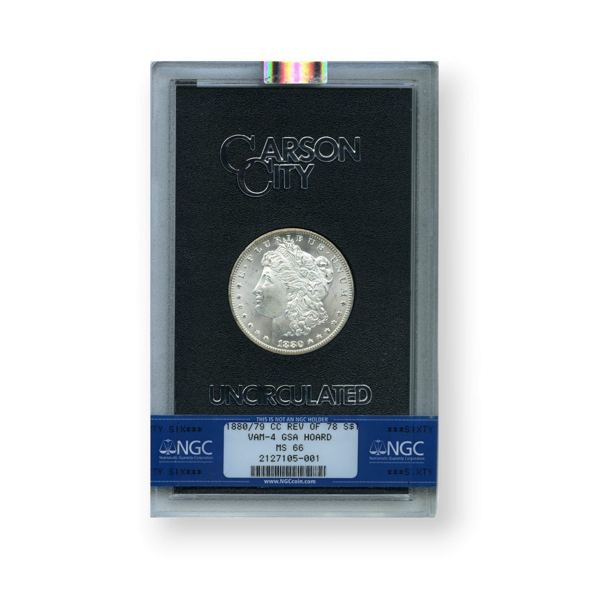 The 1880/79-CC Rev 78 GSA Uncirculated Morgan Silver Dollar is a numismatic rarity known for its distinctive features. It exhibits a reverse with the "78" of the date over a previously impressed "79," making it a sought-after variety among collectors. This coin features the classic Morgan Silver Dollar design, with Lady Liberty on the obverse and an eagle on the reverse. The "CC" mintmark signifies that it was minted at the Carson City Mint in Nevada. The "GSA" (General Services Administration) designation indicates that it was part of the hoard of uncirculated Morgan Silver Dollars released by the U.S. government in the 1970s, making it a highly collectible and valuable addition to numismatic collections.