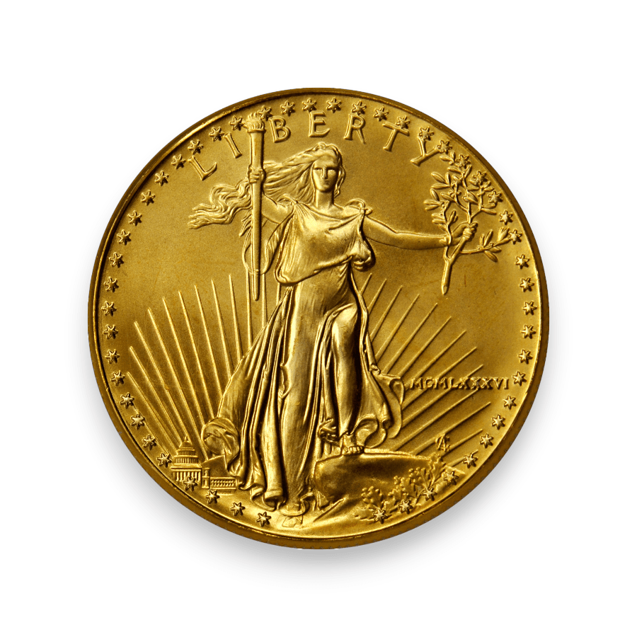 The 1986 1 oz American Gold Eagle Coin, bearing the Roman numeral "MCMLXXXVI" for the year 1986, is the first issue in the American Gold Eagle series produced by the United States Mint. This coin contains one ounce of gold with a purity of 22 karats, or .9167 fineness. It features the Saint-Gaudens design on the obverse, showcasing Lady Liberty with a torch and olive branch, and the reverse, designed by Miley Busiek, displays a family of eagles. The mintage for the 1986 1 oz American Gold Eagle was approximately 1,362,650 coins. This inaugural issue is particularly significant and sought-after by collectors and investors for its historical importance, high gold content, and the introduction of the iconic design in the American Gold Eagle series.