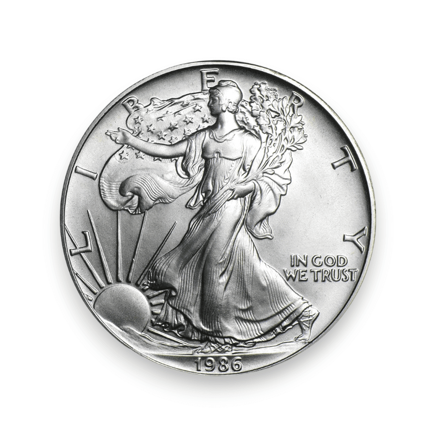 The 1986 1 oz American Silver Eagle Coin, as the inaugural issue of the American Silver Eagle series, is highly valued by collectors and investors. It contains one ounce of .999 fine silver, with a purity of 99.9%. This coin features the renowned "Walking Liberty" design by Adolph A. Weinman on the obverse, an iconic image that has been a staple of American coinage. The reverse, designed by John Mercanti, showcases a heraldic eagle behind a shield. Significantly, the mintage for this first year of the series was approximately 5,393,005, making the 1986 American Silver Eagle both a popular and historically important coin for collectors, prized for its silver content and its status as the beginning of one of the most famous silver bullion series.
