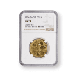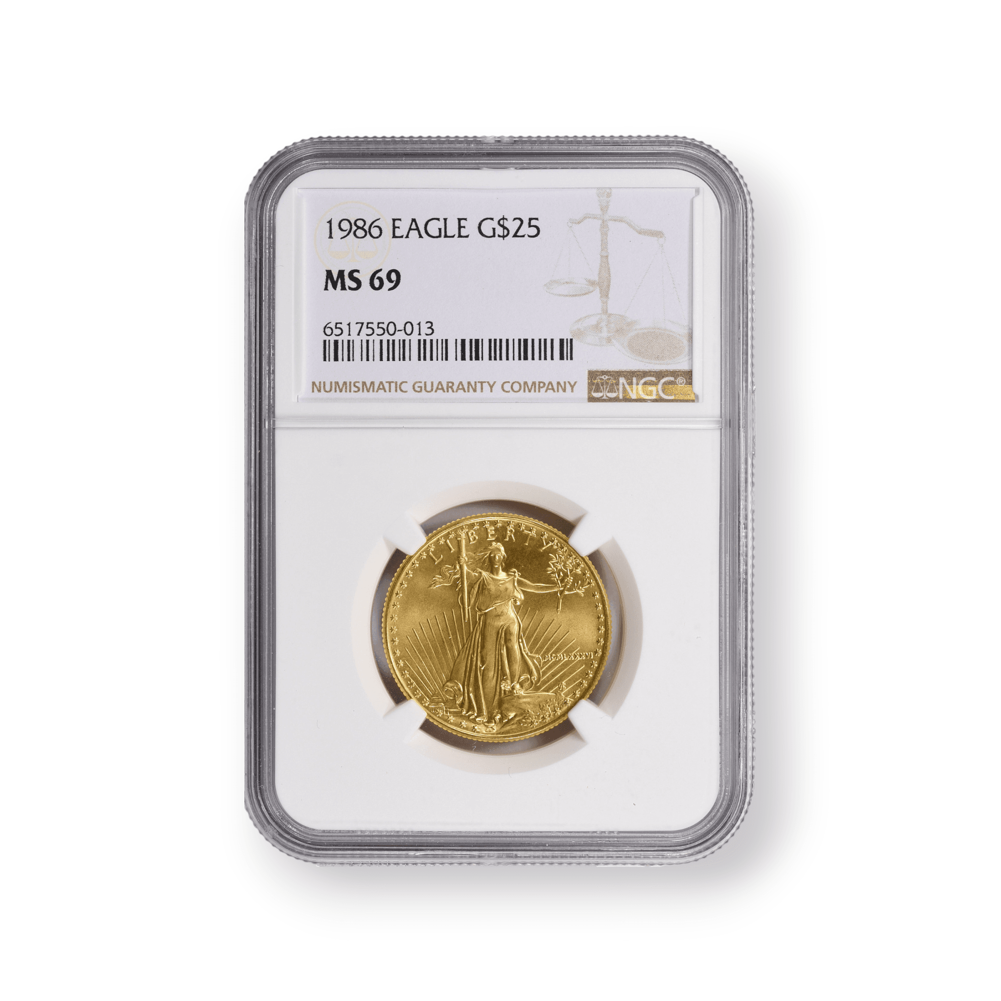 The 1986 $25 American Gold Eagle, certified by the Numismatic Guaranty Corporation (NGC), is a half-ounce gold coin composed of 22-karat gold, with a purity of .9167. This coin holds the distinction of being part of the first issue year of the American Gold Eagle series. It features the historic Saint-Gaudens design with Lady Liberty on the obverse and Miley Busiek's design of a family of eagles on the reverse. With a mintage of 599,566, it is a significant piece for collectors and investors alike. The NGC certification assures the coin's condition and authenticity, enhancing its collectibility and value in the gold bullion coin market.