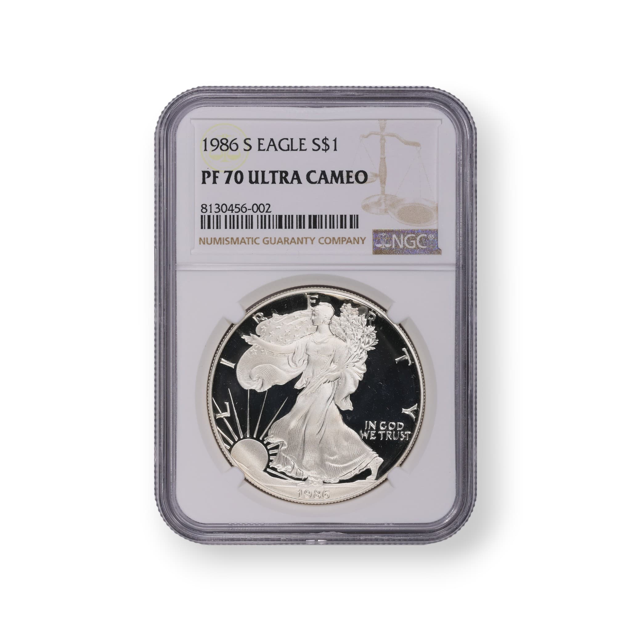 The 1986-S Proof American Silver Eagle $1 Coin is a highly sought-after numismatic item. Struck by the United States Mint in San Francisco, this coin is composed of .999 fine silver and has a weight of 31.101 grams. With a diameter of 40.6 millimeters, the coin features the iconic Walking Liberty design by Adolph A. Weinman on the obverse and the heraldic eagle design by John Mercanti on the reverse. This particular coin has been certified by the Numismatic Guaranty Corporation (NGC) and is encapsulated for protection. The mintage for the 1986-S Proof American Silver Eagle is 1,446,778 coins, making it a valuable addition to any collection.