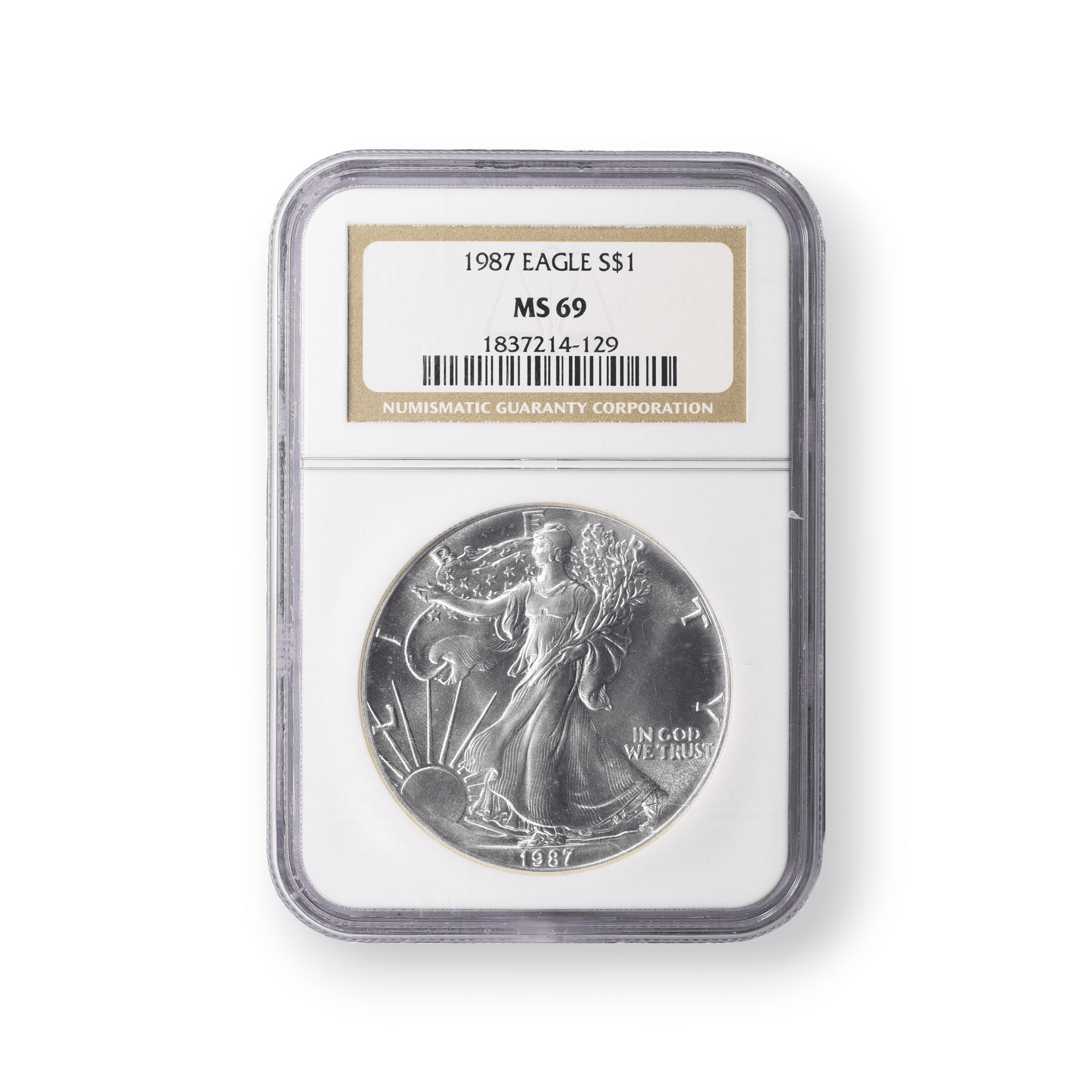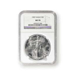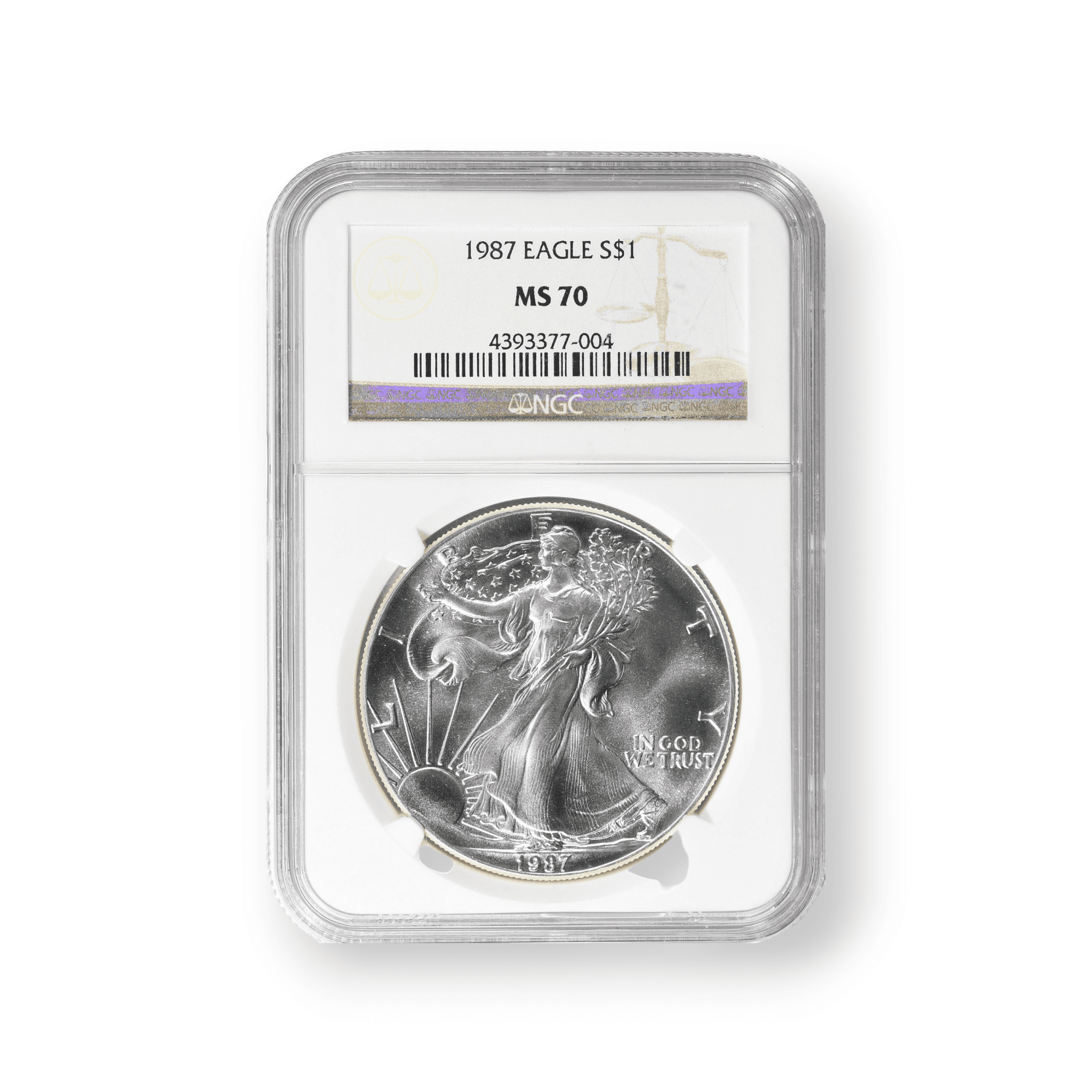 The 1987 $1 American Silver Eagle, graced with NGC certification, represents a significant piece of American minting history with a mintage of 11,442,335 coins. Struck from one troy ounce of .999 fine silver, it carries the timeless Walking Liberty design by Adolph A. Weinman on the obverse, embodying the nation's foundational principles of freedom and liberty. The reverse features John Mercanti's heraldic eagle with a shield, capturing the essence of America's strength and sovereignty. NGC certification assures collectors of the coin's authenticity and quality, enhancing its value and making it a notable addition to any collection, both for its silver content and its numismatic merit.