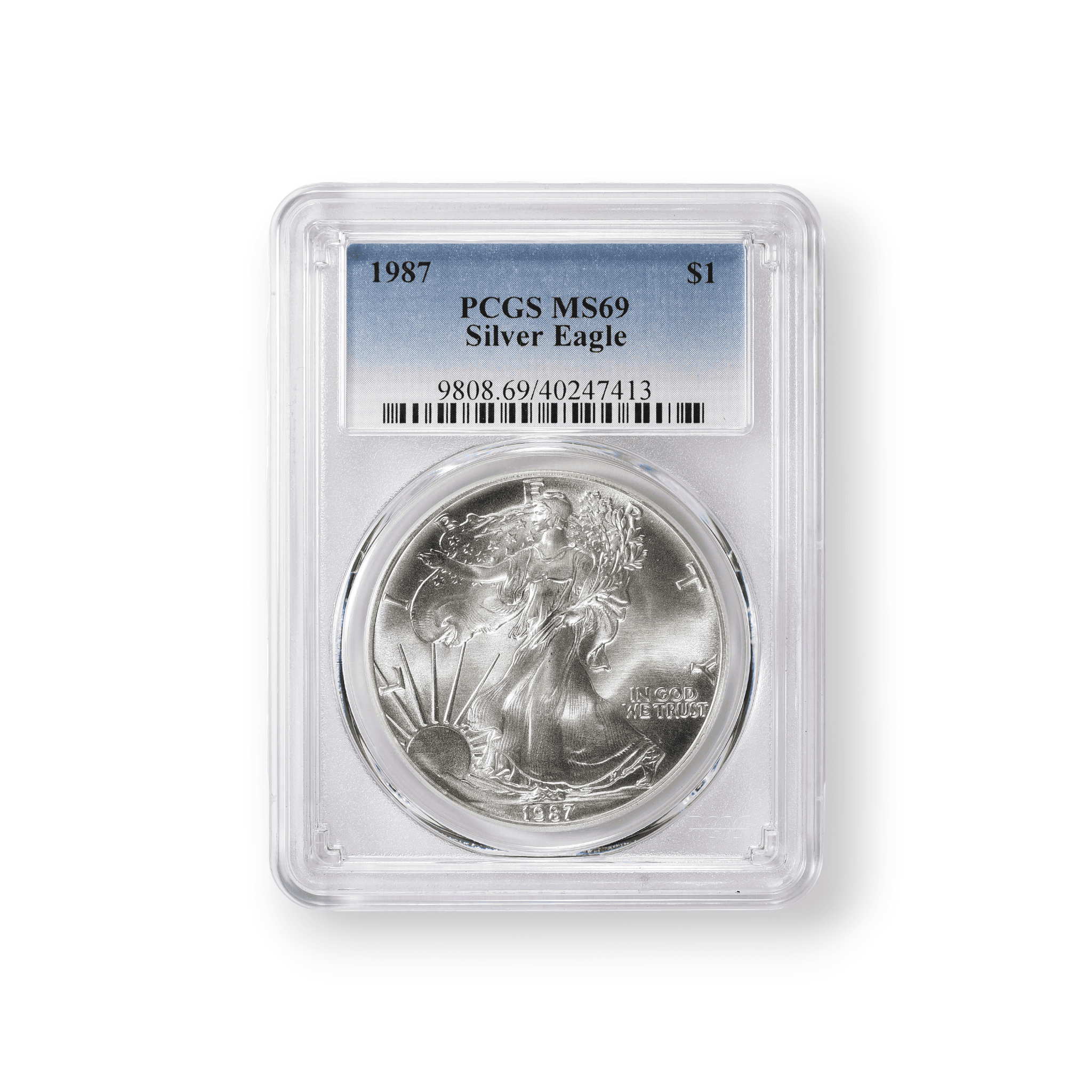 In 1987, the U.S. Mint released the American Silver Eagle coin with a substantial mintage of 11,442,335. Each of these coins is composed of one ounce of 99.9% pure silver. The obverse showcases the revered Walking Liberty design by Adolph A. Weinman, a symbol of the nation's relentless pursuit of freedom and opportunity. On the reverse, a heraldic eagle designed by John Mercanti signifies the United States' preparedness and resilience. Certified by the PCGS, this coin's authenticity and mint state are assured, making it a prized possession for both its intrinsic silver value and its numismatic prestige.
