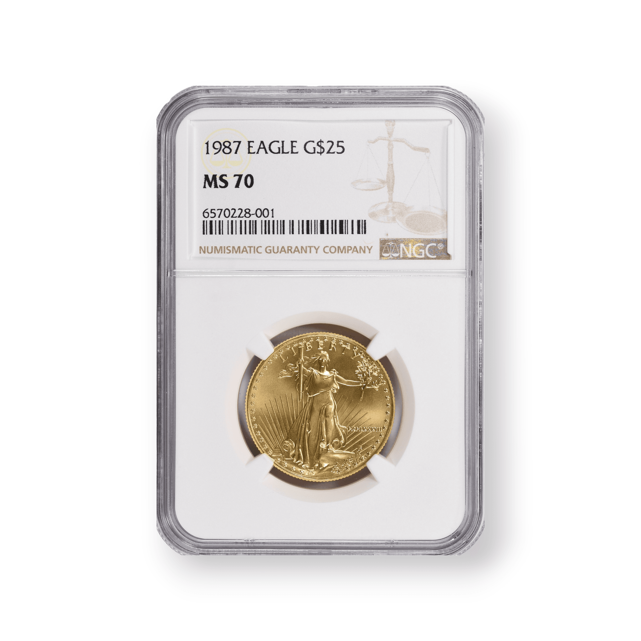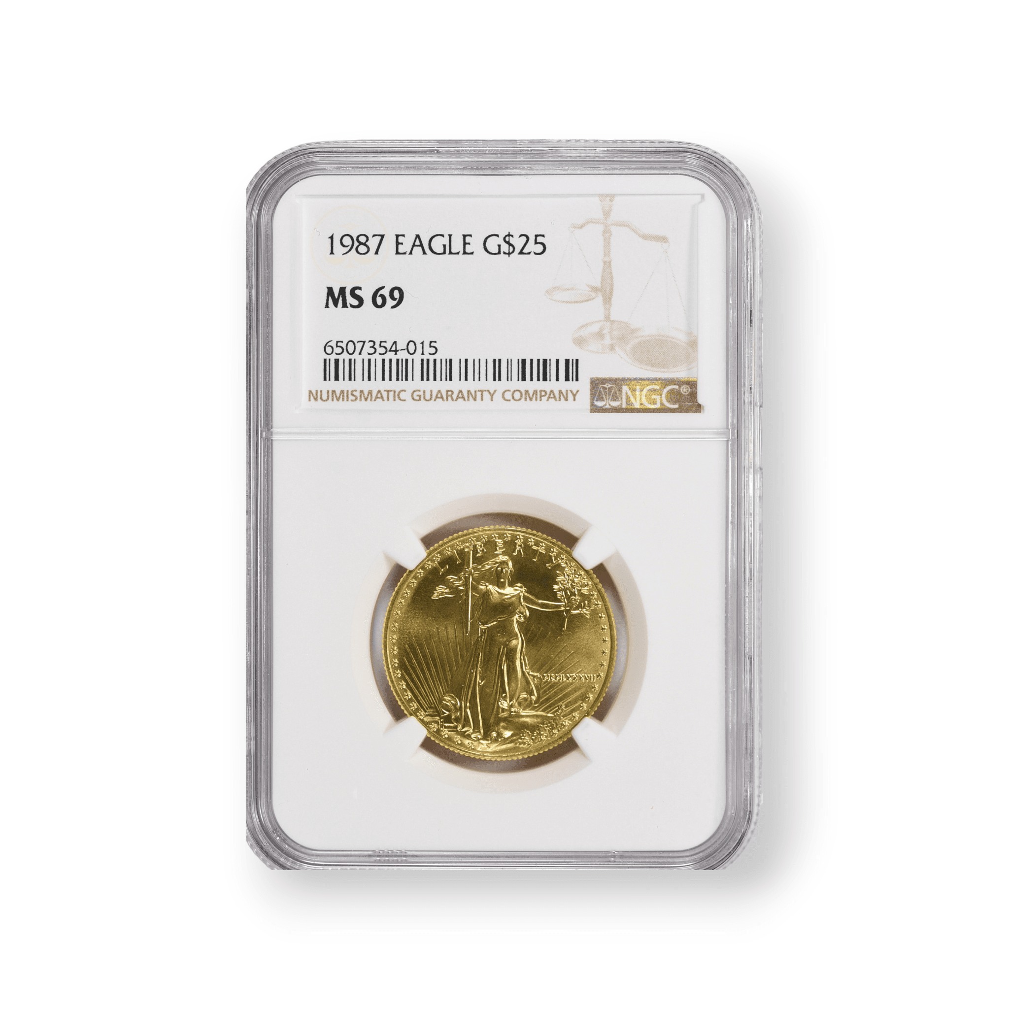 The 1987 $25 American Gold Eagle, certified by the Numismatic Guaranty Corporation (NGC), is a half-ounce gold coin with a 22-karat gold composition, reflecting a .9167 fineness. It features the renowned Saint-Gaudens obverse design of Lady Liberty and the Miley Busiek reverse design showcasing a family of eagles. This coin, with a mintage of 131,255, is certified by NGC for its condition and authenticity, enhancing its appeal to collectors and investors as a significant piece of American numismatic history and a valuable gold investment.