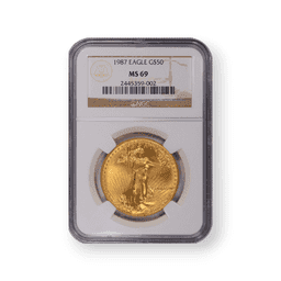The 1987 1 oz American Gold Eagle, denoted by the Roman numeral MCMLXXXVII, is a distinguished piece in the United States Mint's American Gold Eagle series. Minted in .9167 fine gold (22 karat), this coin carries the celebrated designs of Lady Liberty by Augustus Saint-Gaudens on the obverse and the familial eagle scene by Miley Busiek on the reverse. The NGC certification indicates that the coin has undergone a thorough evaluation by the Numismatic Guaranty Corporation, ensuring its authenticity and condition. As the second year of issue for the American Gold Eagle series, the 1987 edition holds a special place among collectors and investors, offering not just a piece of American numismatic history but also a valuable and certified investment in precious metal.