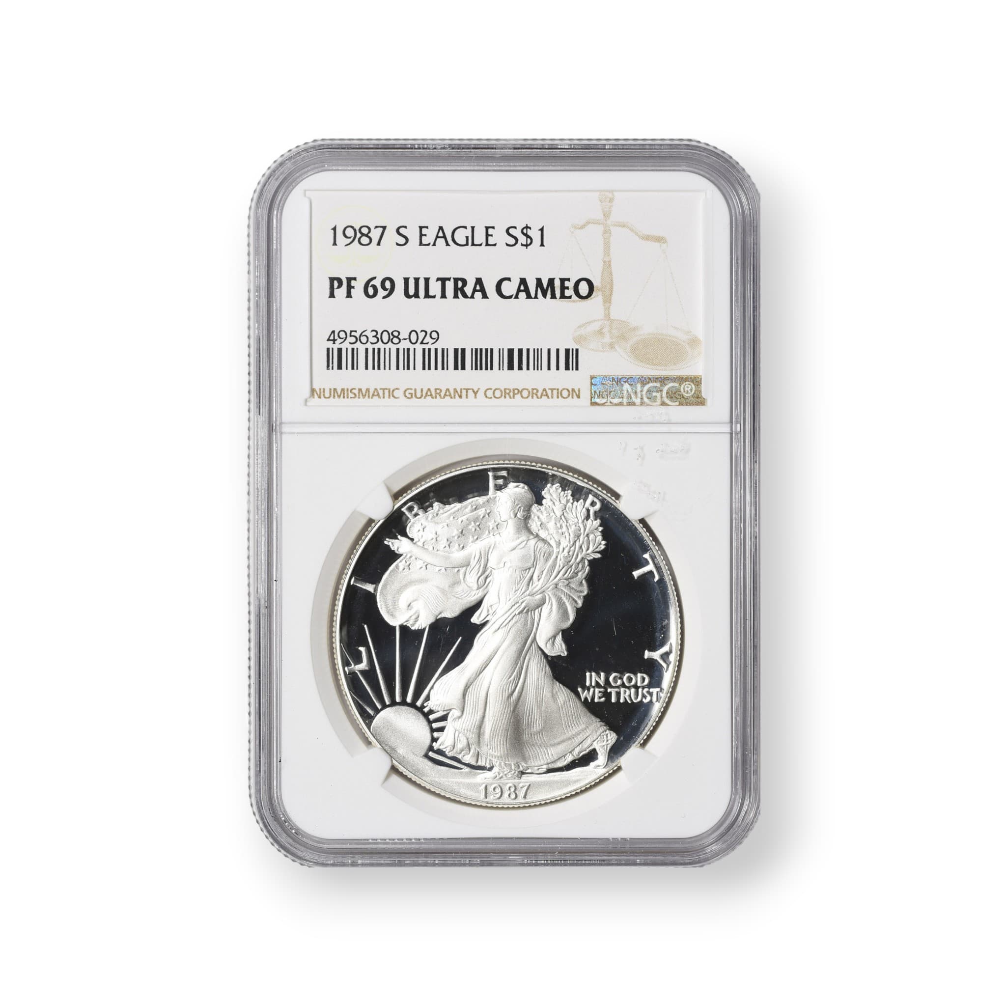 The 1987-S Proof American Silver Eagle $1 Coin is a highly sought-after numismatic item. Struck by the United States Mint in San Francisco, this coin is composed of .999 fine silver and weighs 31.101 grams. With a diameter of 40.6 mm and a reeded edge, the obverse features the iconic Walking Liberty design by Adolph A. Weinman, while the reverse showcases the heraldic eagle with shield design by John Mercanti. This particular coin has been certified by the Numismatic Guaranty Corporation (NGC) and comes encapsulated, ensuring its authenticity and condition. The mintage for the 1987-S Proof American Silver Eagle is 1,037,459 coins, making it a valuable addition to any collection.